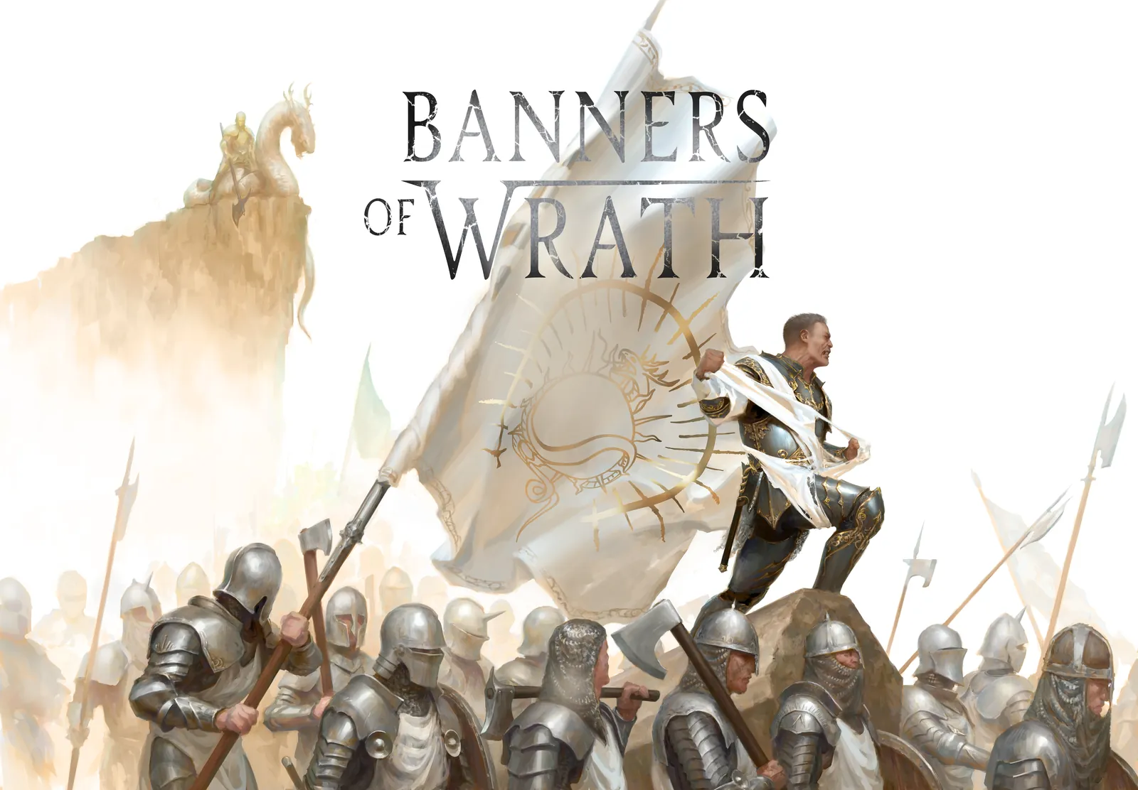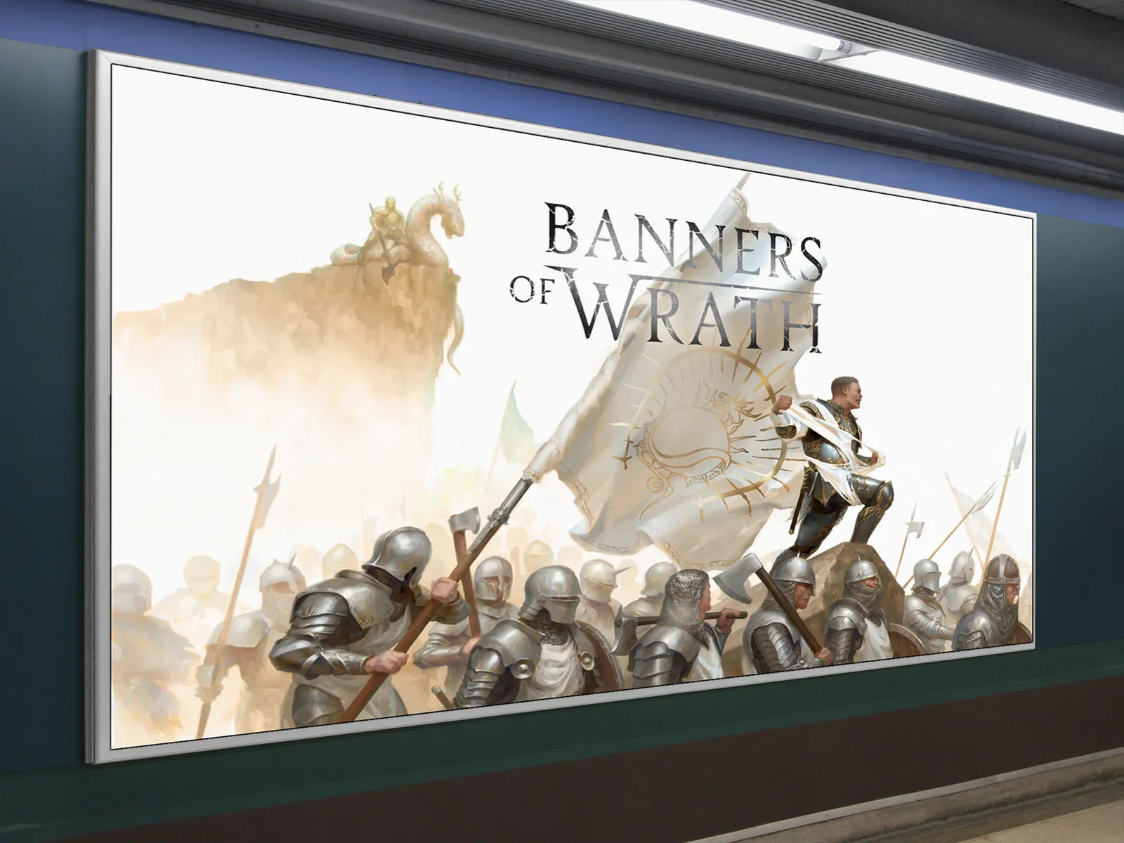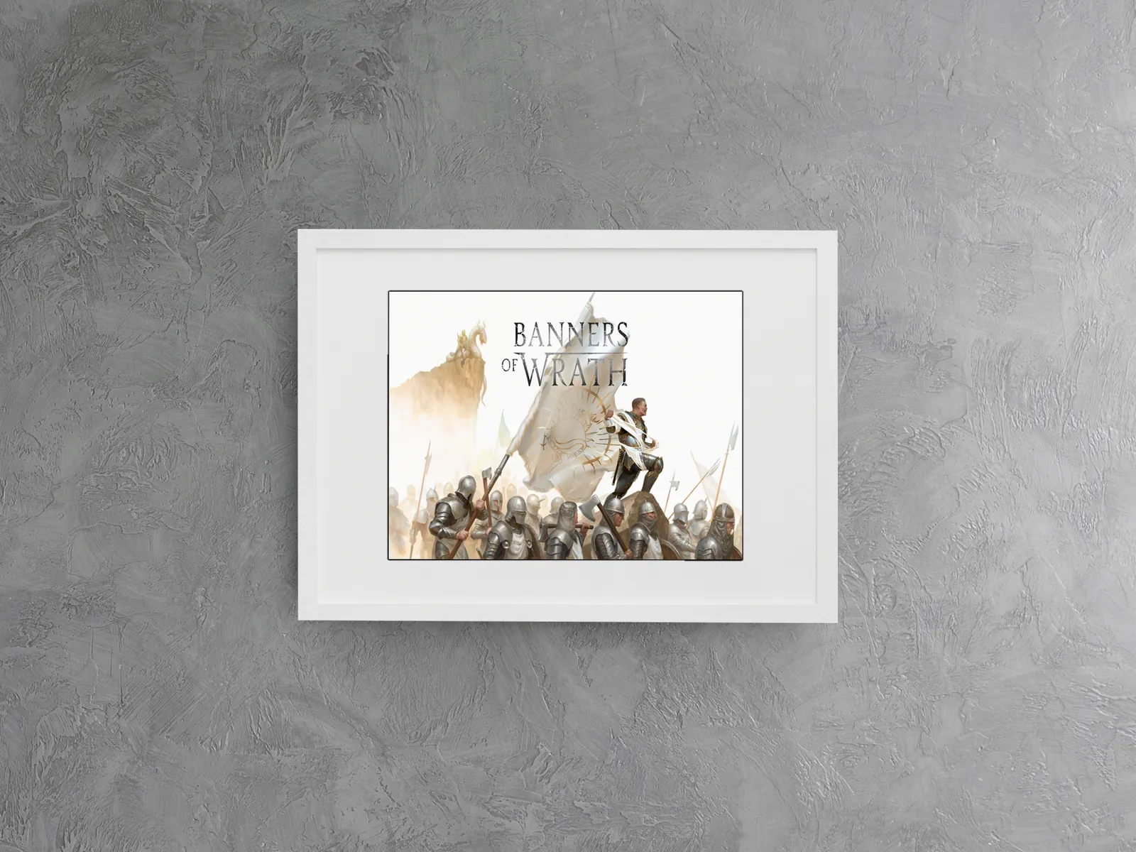 Moreover, the upward flow of the composition draws attention from the armored soldiers to the banner itself, reinforcing leadership and purpose. Angled weapons, marching forms, and billowing fabric create motion and tension. As a result, the piece reads powerfully at both close range and distance.