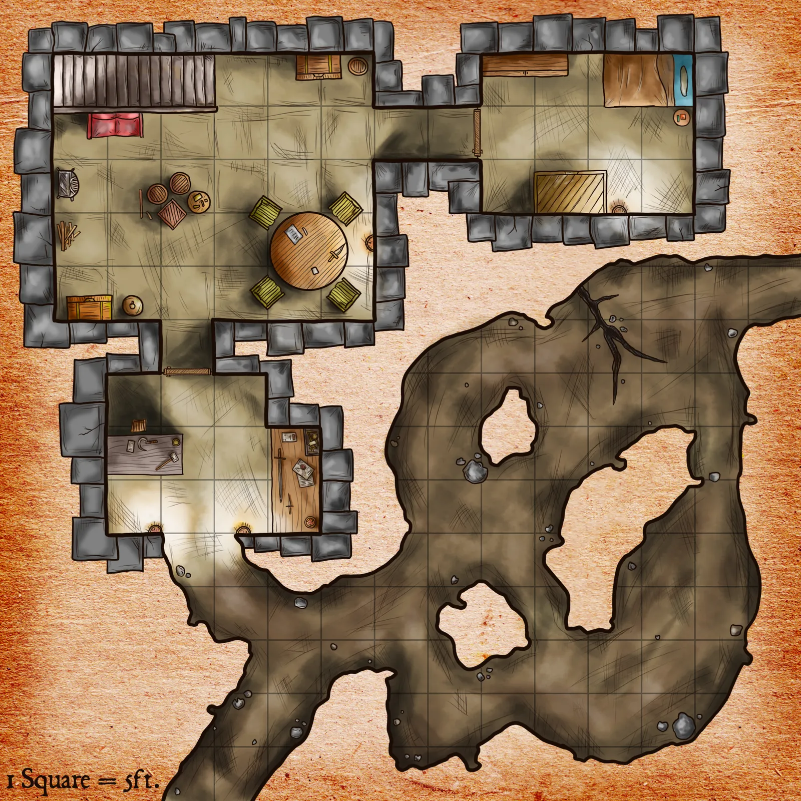 Stone chambers meet natural caverns in a split-level dungeon encounter. This basement s pasage fantasy battle map canvas print shows a fortified structure bleeding into cave tunnels. Notably, the gridded parchment texture anchors the warm tan and gray palette.