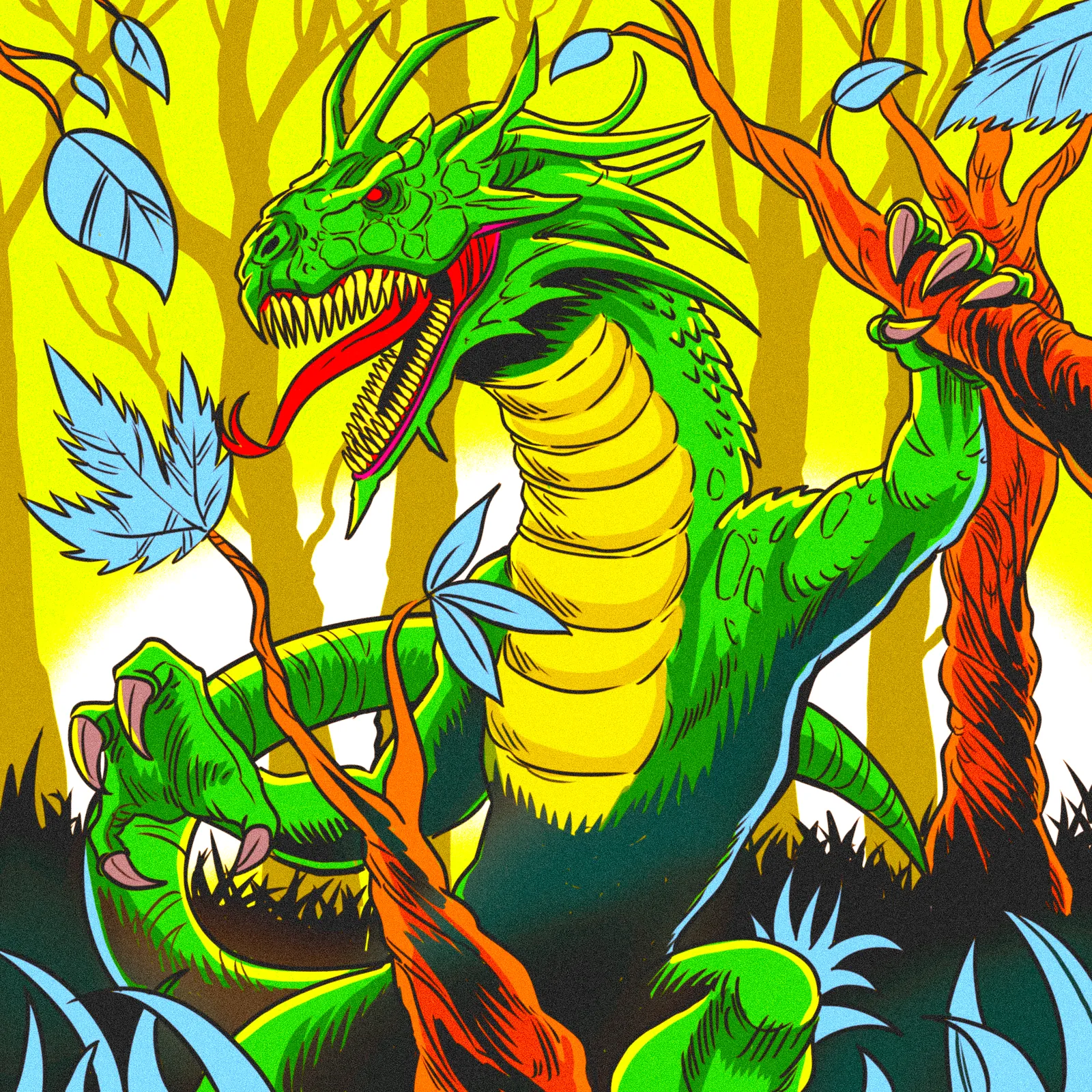Additionally, the bright yellow background and olive tree trunks create depth behind the creature. Pale blue leaves float throughout the composition while dark teal foliage anchors the foreground. Moreover, thick black outlines and flat color fills evoke vintage screen-print techniques.