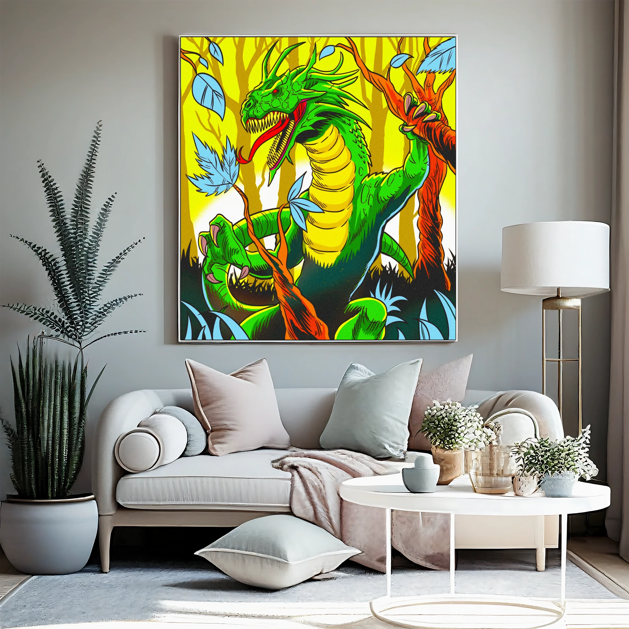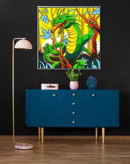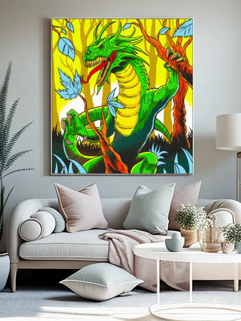 A green dragon with a humanoid torso roars from twisted orange branches. This basilisk art trading card art canvas print captures Fabricio Vainer’s bold comic book illustration style. Notably, the segmented yellow underbelly contrasts sharply against textured emerald scales.
