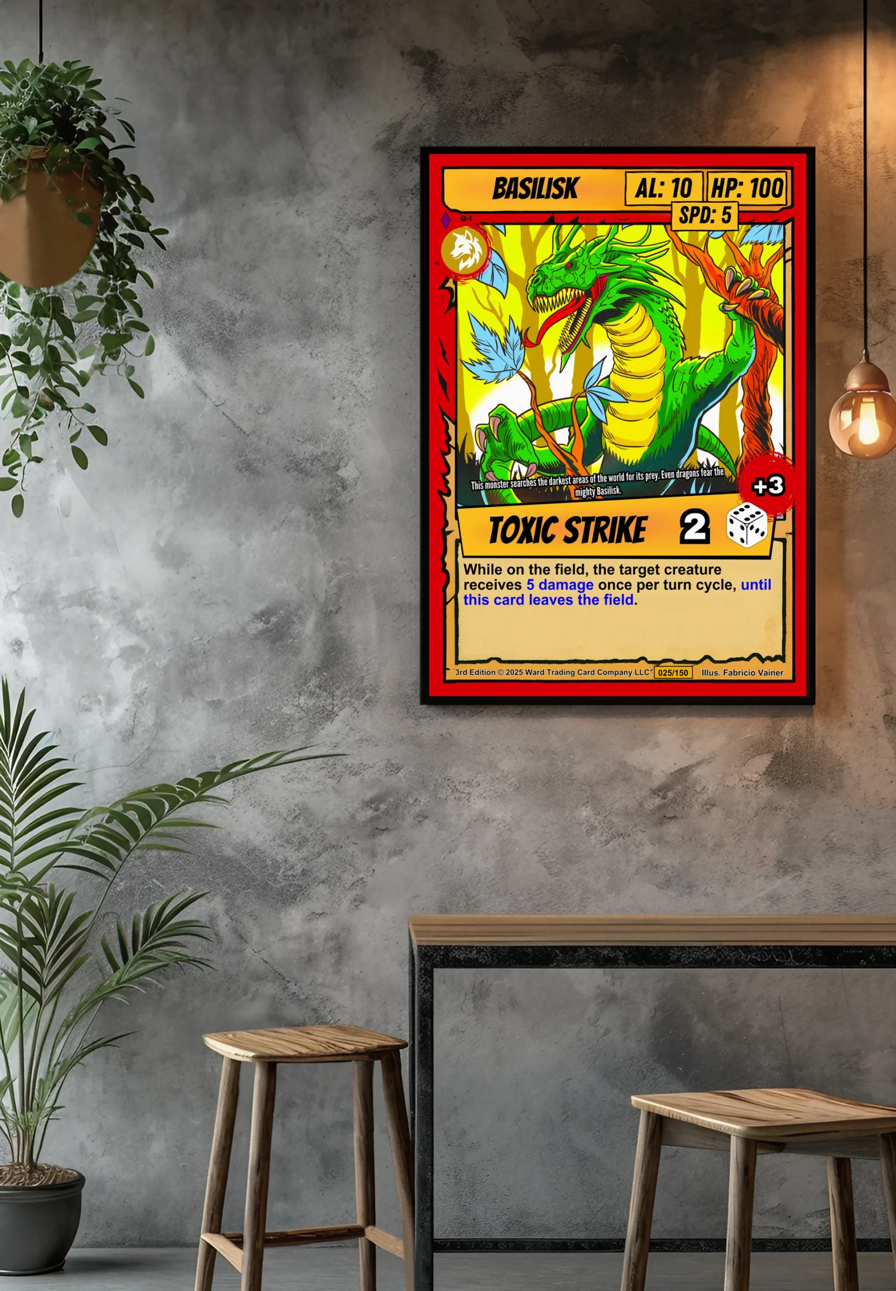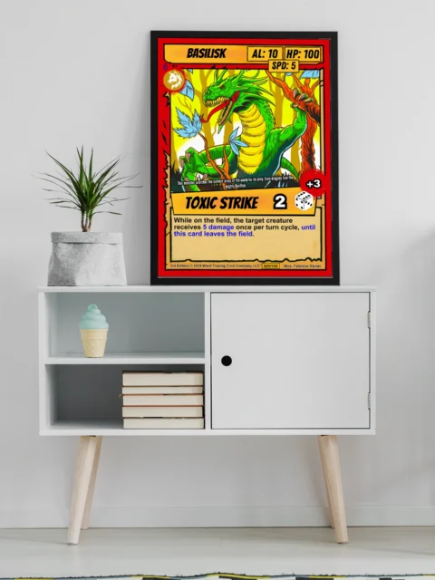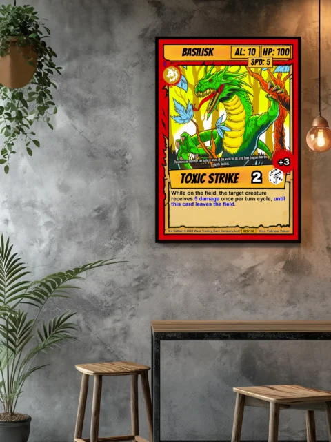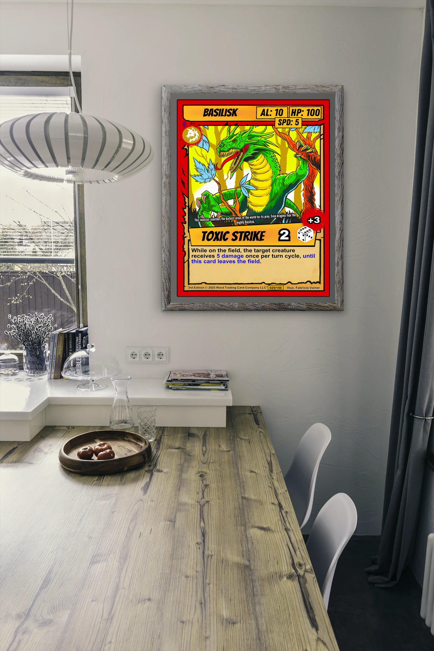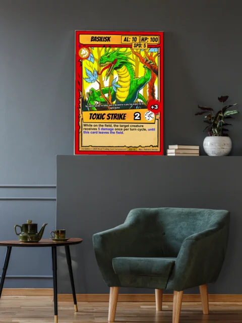 Collectors recognize the authentic 1990s cel-shading that defined legendary card art. TCG enthusiasts value artwork that captures the tactical intensity of creature combat. Particularly, this basilisk trading card canvas print delivers that nostalgic comic book energy.