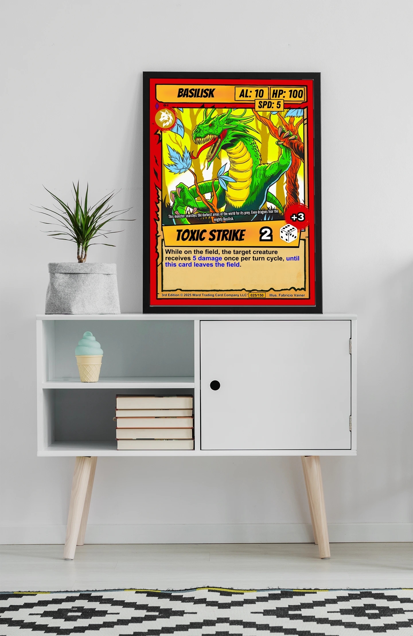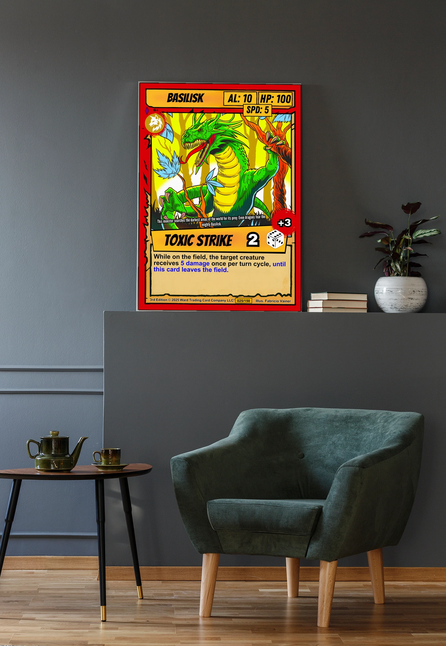 A serpentine basilisk coils with fangs bared and crystalline staff raised. Fabricio Vainer’s artwork transforms this basilisk trading card canvas print into vivid fantasy combat. Notably, the creature’s green scales catch light against deep red borders.