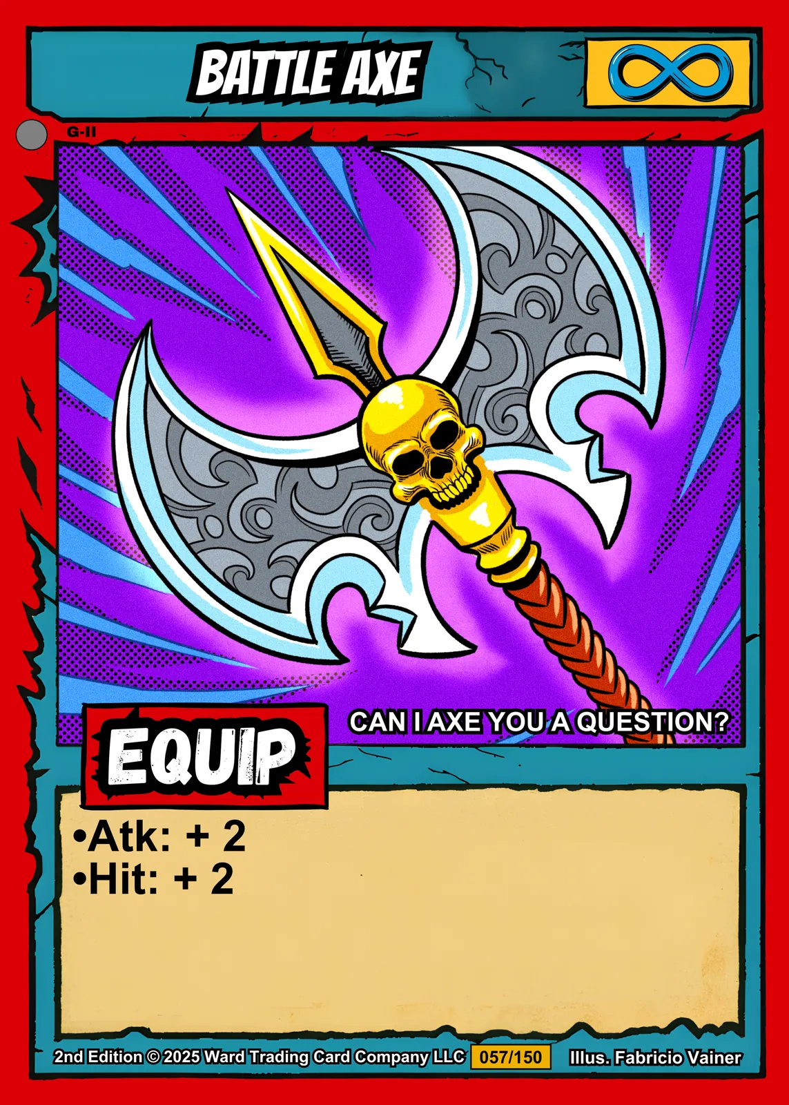 Additionally, the bold red border frames a cyan banner reading ‘BATTLE AXE’ in angular black text. The top left shows ‘G-II’ designation while a blue infinity symbol sits in a yellow box at top right. White stat text reads ‘Atk: +2’ and ‘Hit: +2’ below the red ‘EQUIP’ banner.