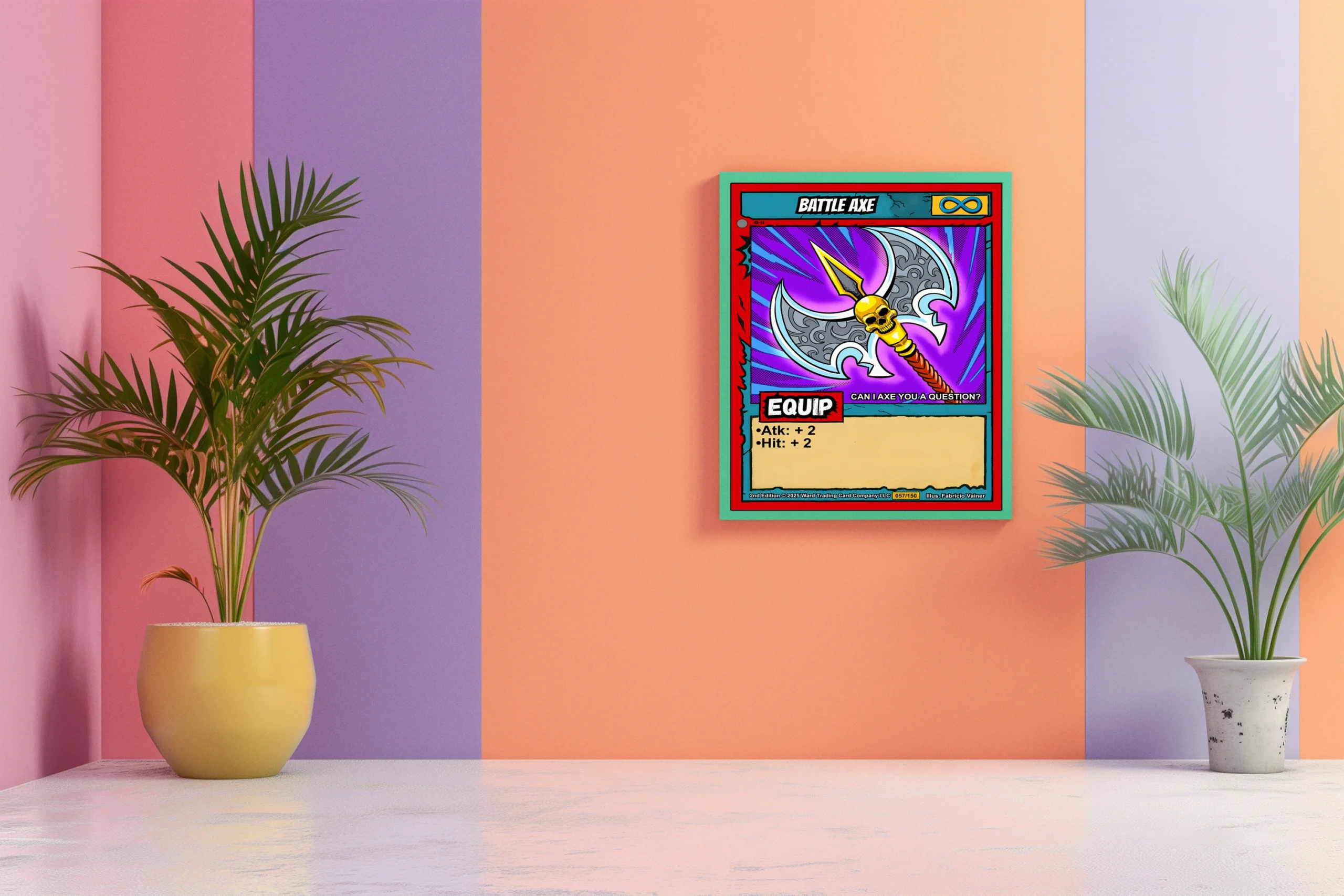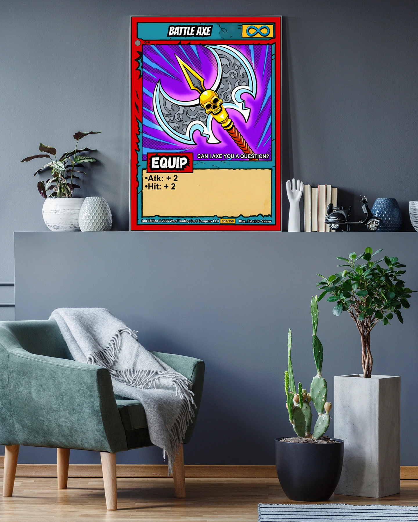 The radiating blue speed lines and purple halftone gradient create constant motion at room scale. Collectors of Ward TCG equipment cards and weapon-focused builds recognize this battle axe trading card canvas print immediately. The humor in ‘CAN I AXE YOU A QUESTION?’ flavor text lands clearly from across the room.