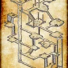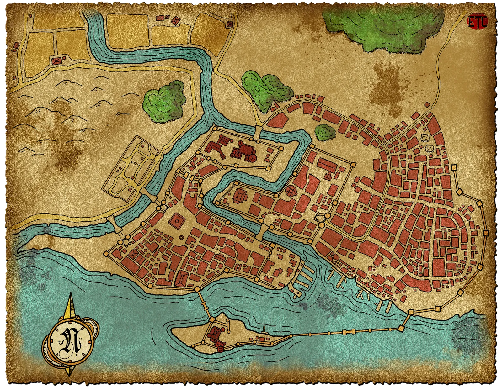 What is more, the torn parchment edges frame the entire settlement like a recovered artifact. Green vegetation patches mark the northern farmland outside the densely packed urban core. The bright river cuts a clear path through brown and red terrain tones.