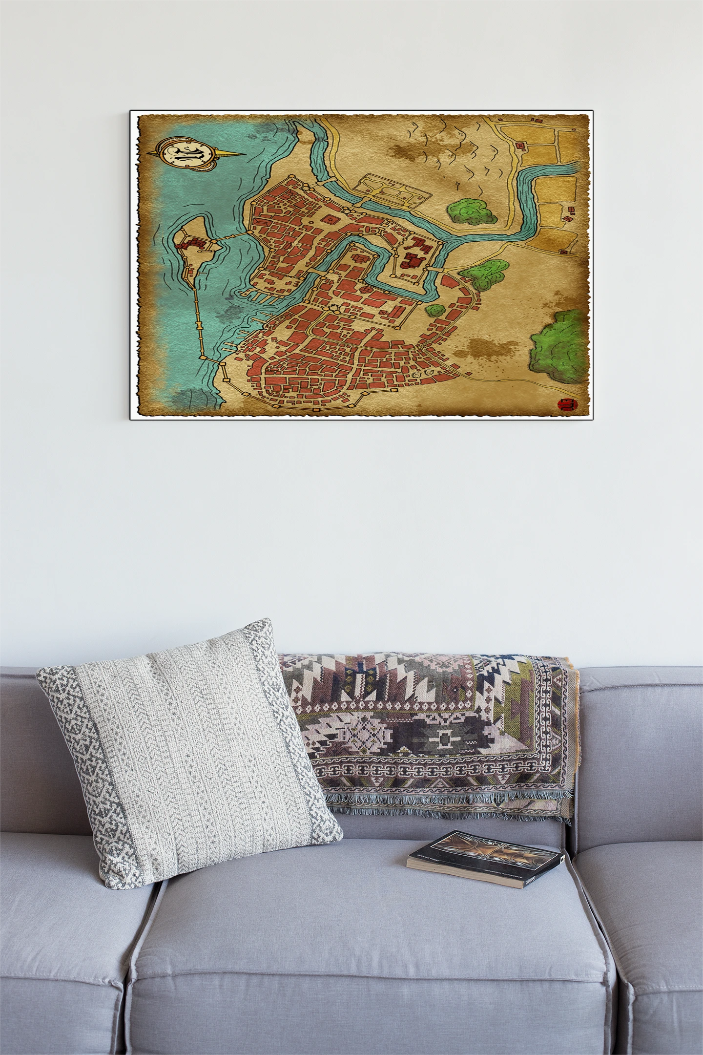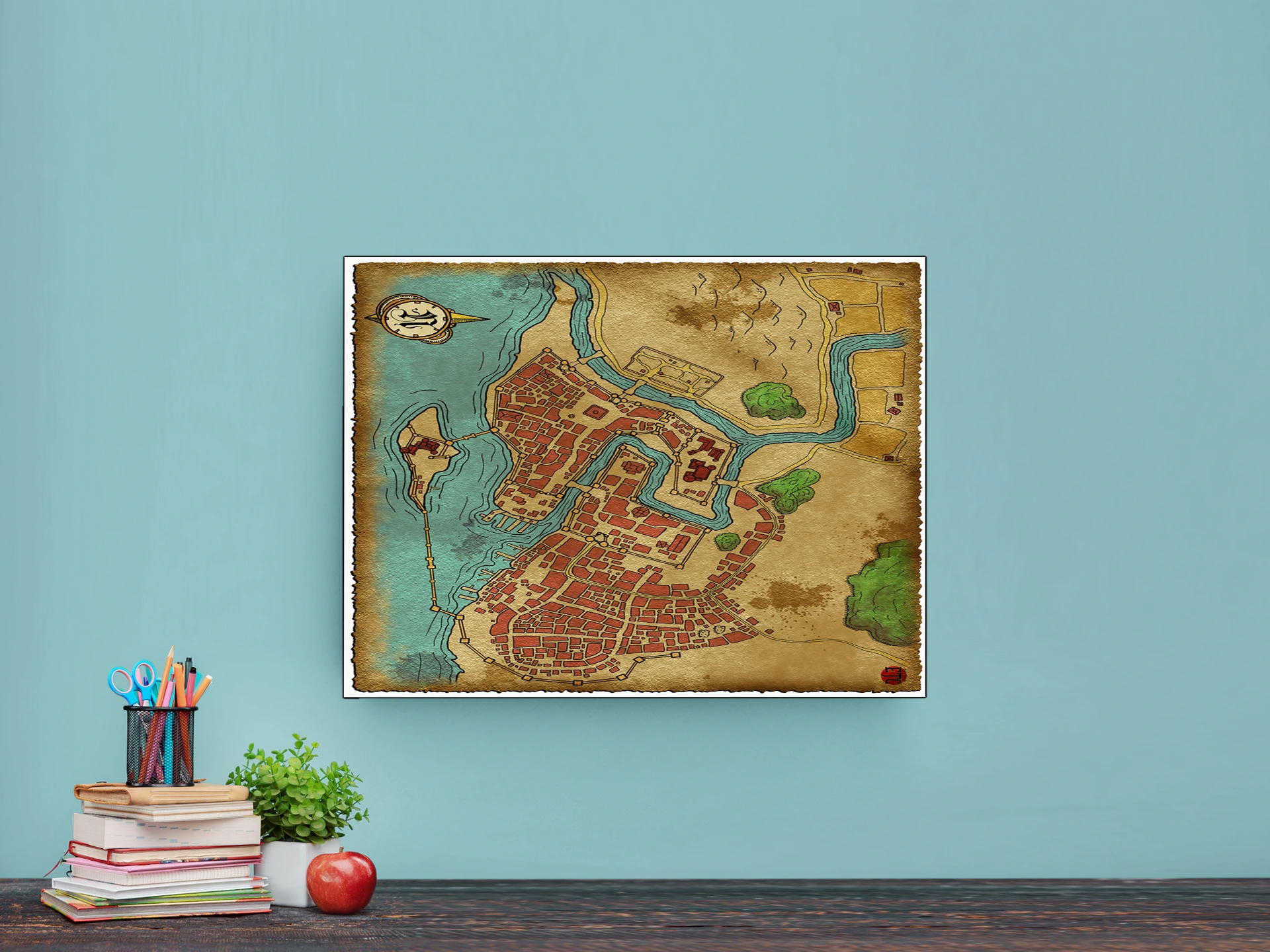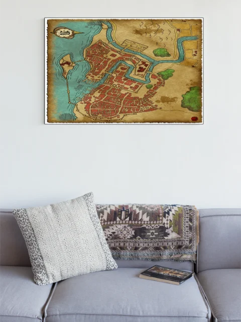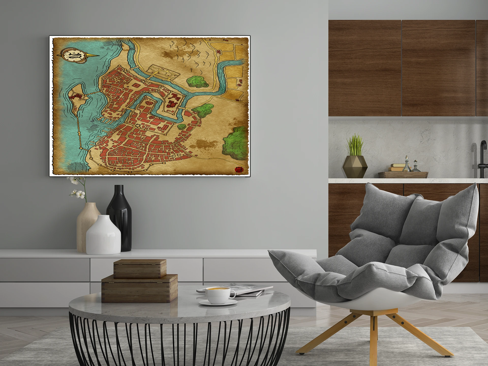 Collectors who run urban intrigue campaigns recognize immediately what this represents. This map belongs to dungeon masters who build port cities into their world lore. Particularly, this bay city fantasy battle map canvas print works for anyone running merchant guild plots.