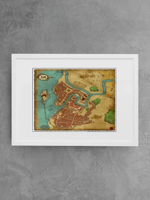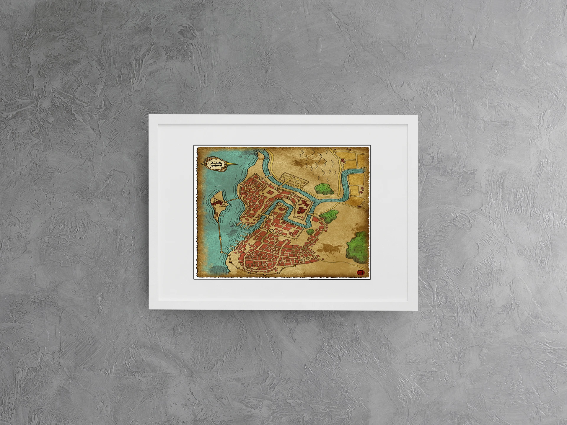 The river districts and compass rose make this work framed above a gaming table. Indeed, the aged parchment aesthetic suits DMs who favor exploration-heavy D&D campaigns.