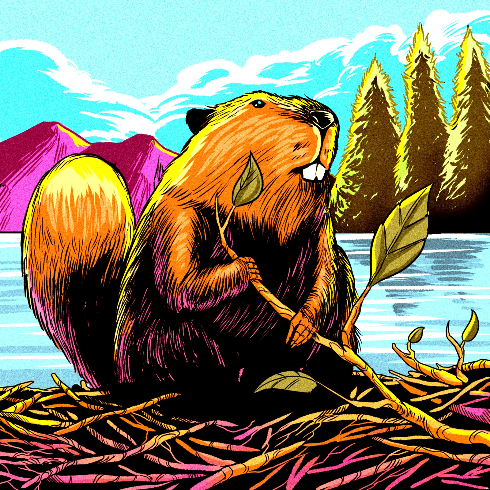 Additionally, the color palette pairs magenta shadowing with a bright yellow paddle-shaped tail. Turquoise sky meets purple mountains and yellow-green conifers behind the subject. The crosshatched fur texture and black outlines indeed evoke vintage woodcut poster art.