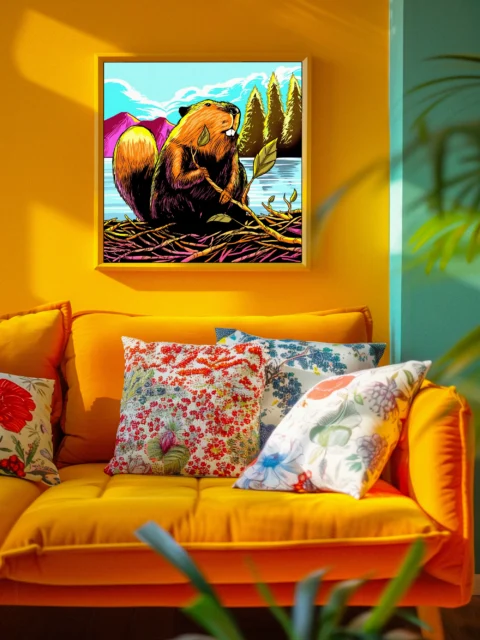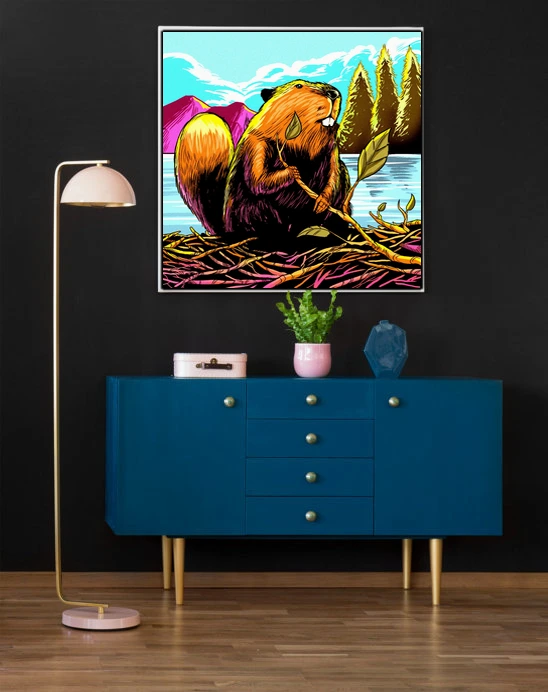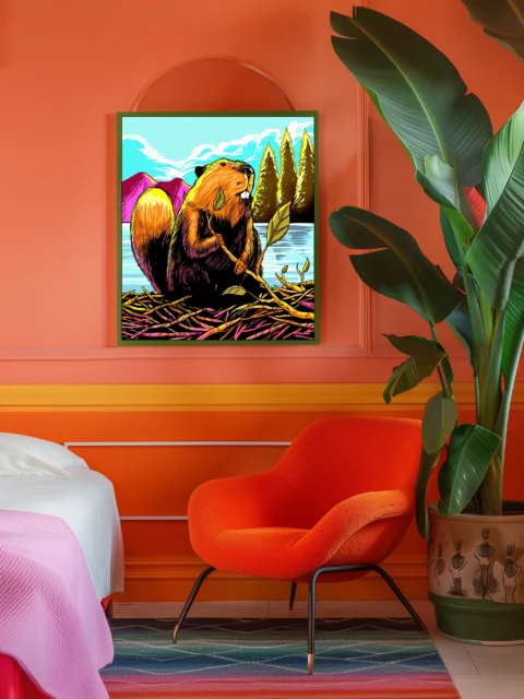 A beaver sits upright on a dam clutching a leafy branch. This beaver art trading card art canvas print showcases Fabricio Vainer’s illustration in bold screen-print style. The beaver’s front teeth are notably prominent against warm orange and brown fur.