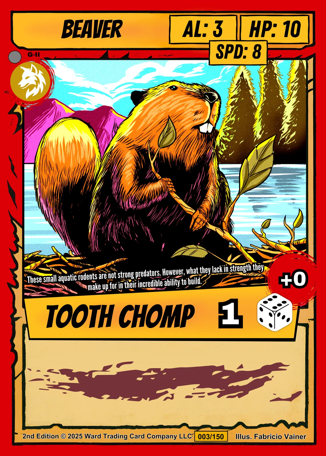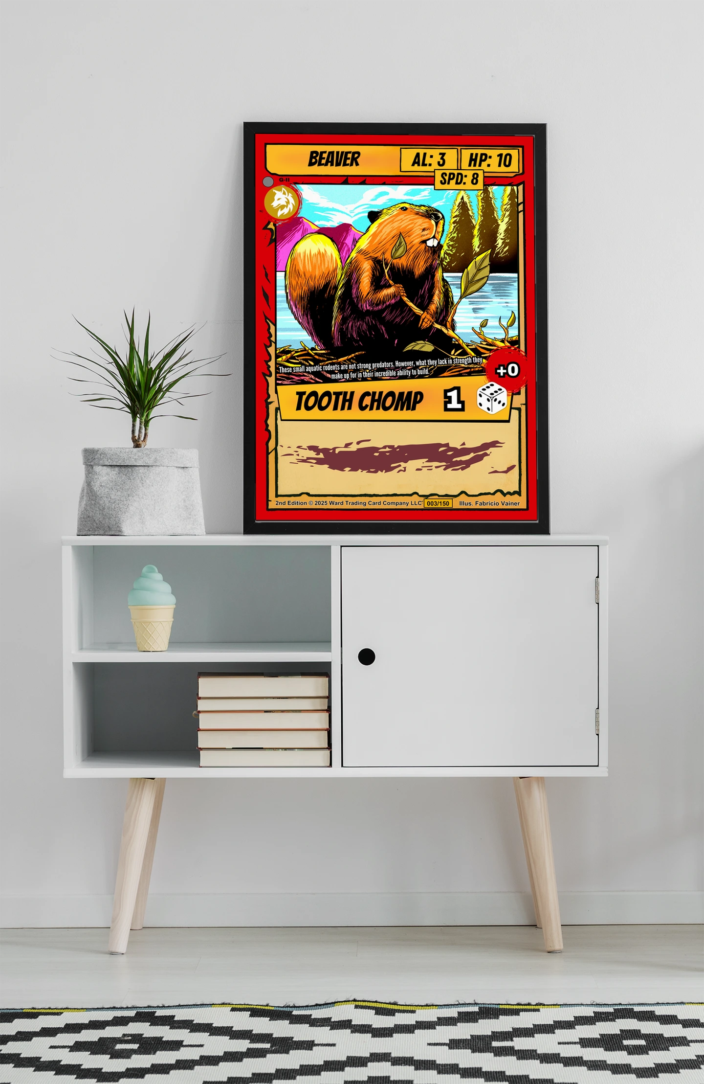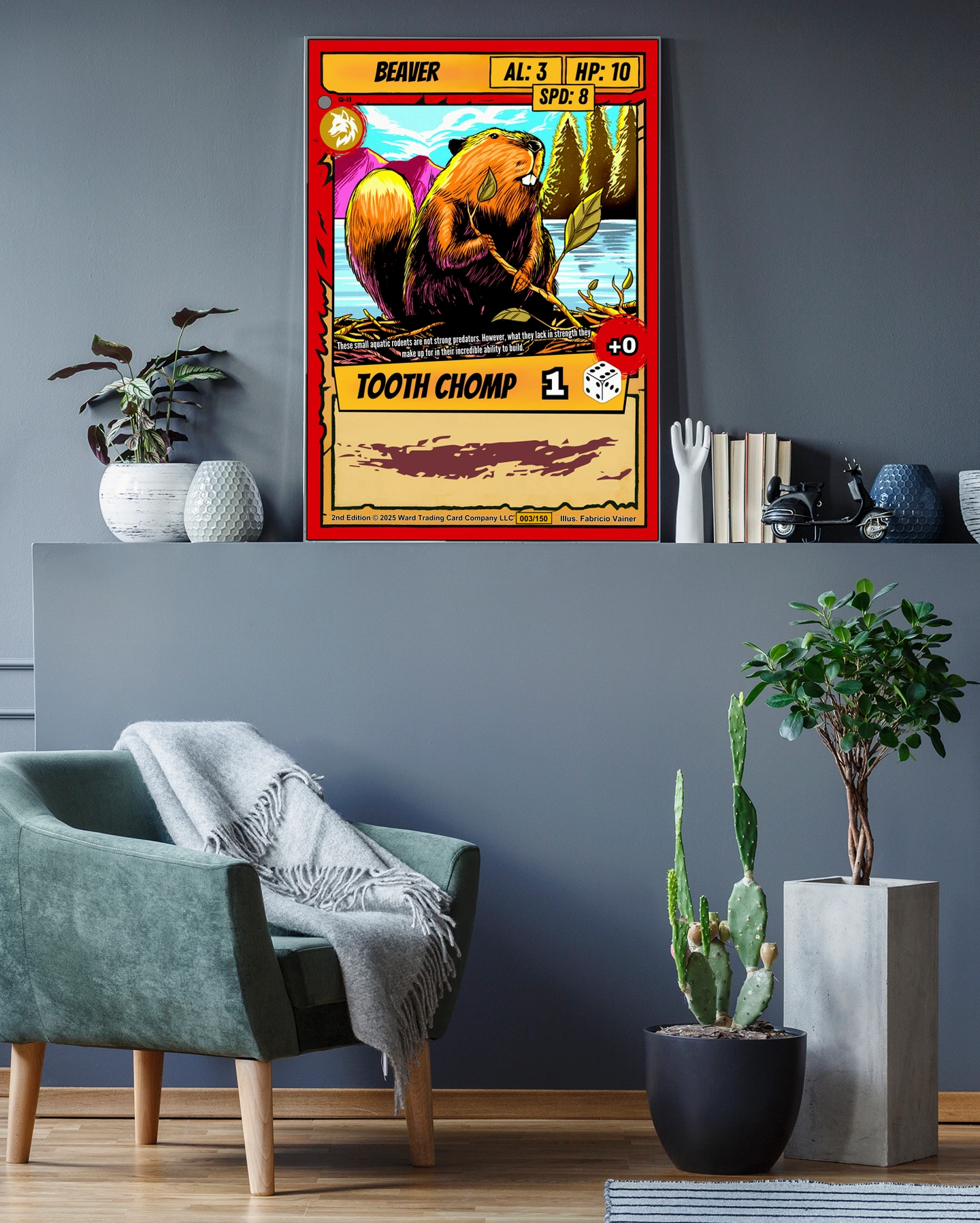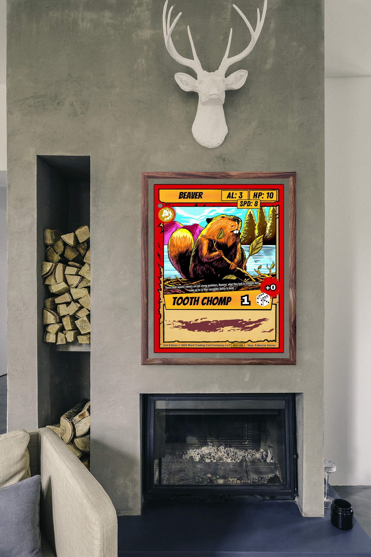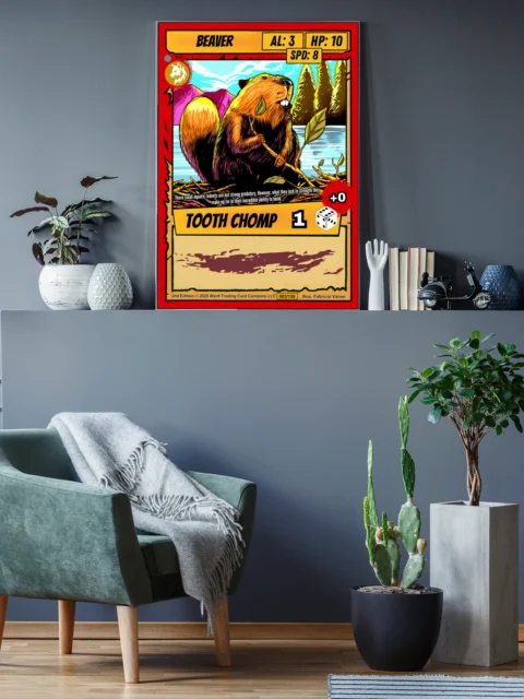 At room scale, the dam of sticks and mountain scenery read clearly across the space. This beaver trading card canvas print speaks to Ward TCG collectors who want Gen 2 artwork displayed large. The red wolf emblem and card number 003/150 remain legible from several feet away.