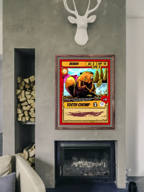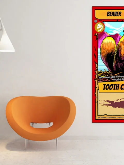 This piece works in game rooms where trading card nostalgia meets wall display. It also fits home offices where playful wildlife art balances workspace formality.