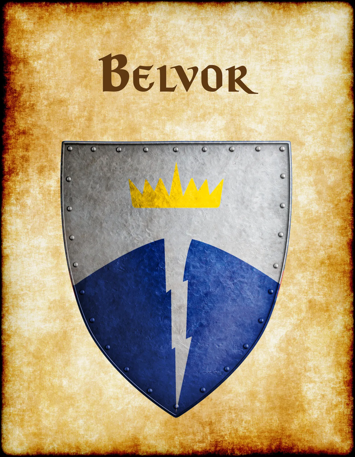 Additionally, Belvor stands among the lesser-known noble houses of the Flanaess, their device marked by storm symbolism. The golden crown signifies feudal authority while the lightning charge suggests martial power or divine favor. Moreover, the argent-and-azure division follows classic tincture rules, giving the device heraldic legitimacy within Greyhawk’s feudal hierarchy.