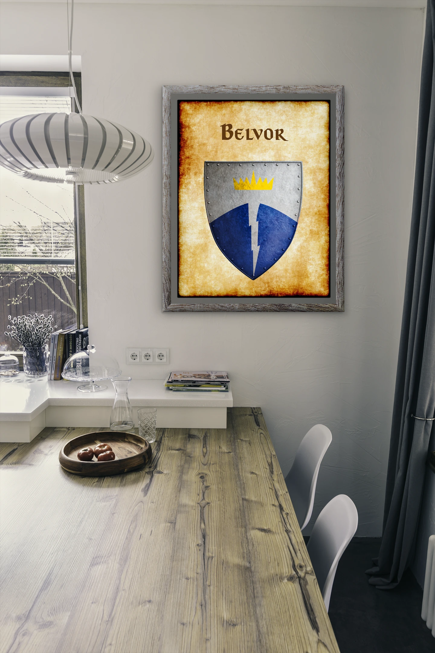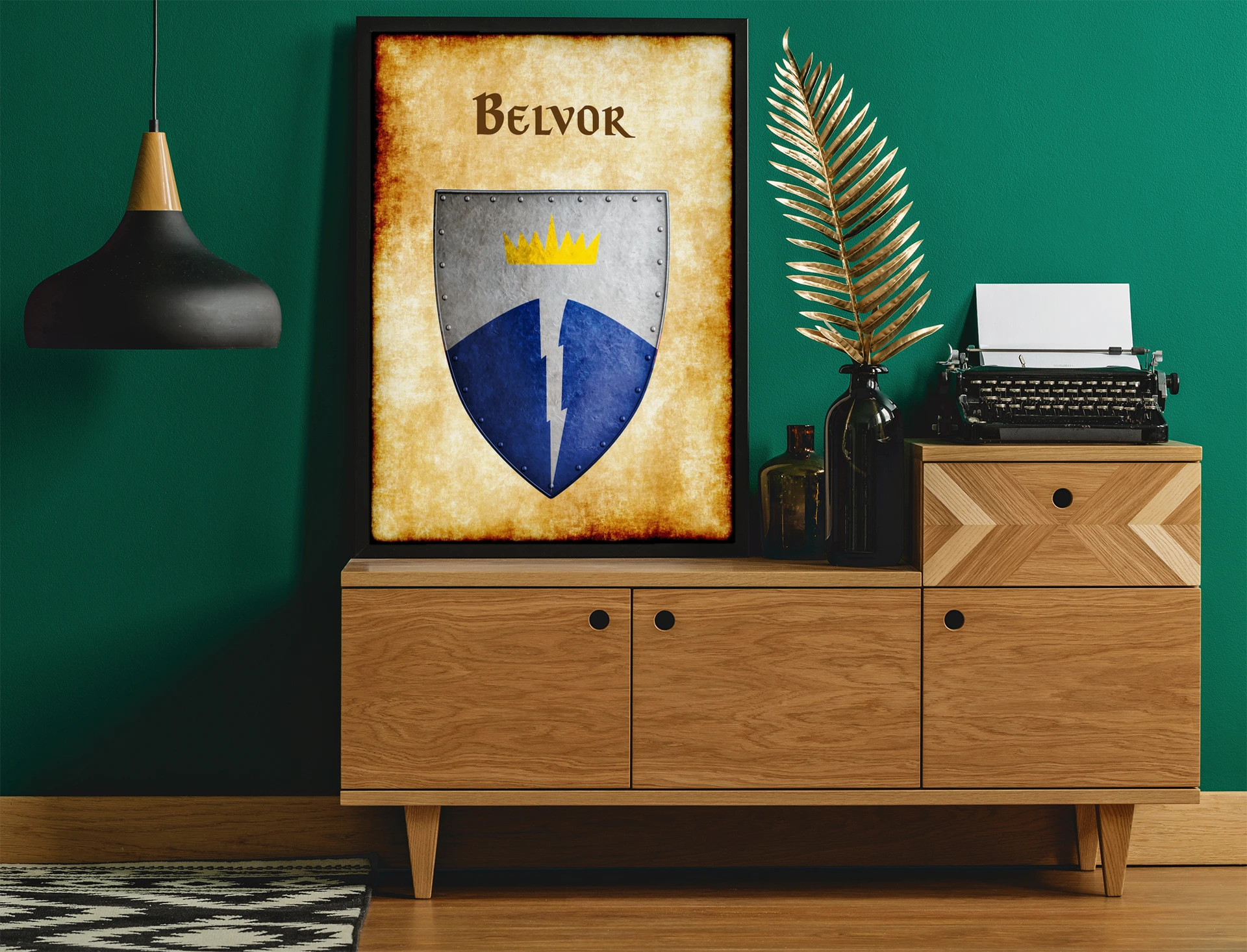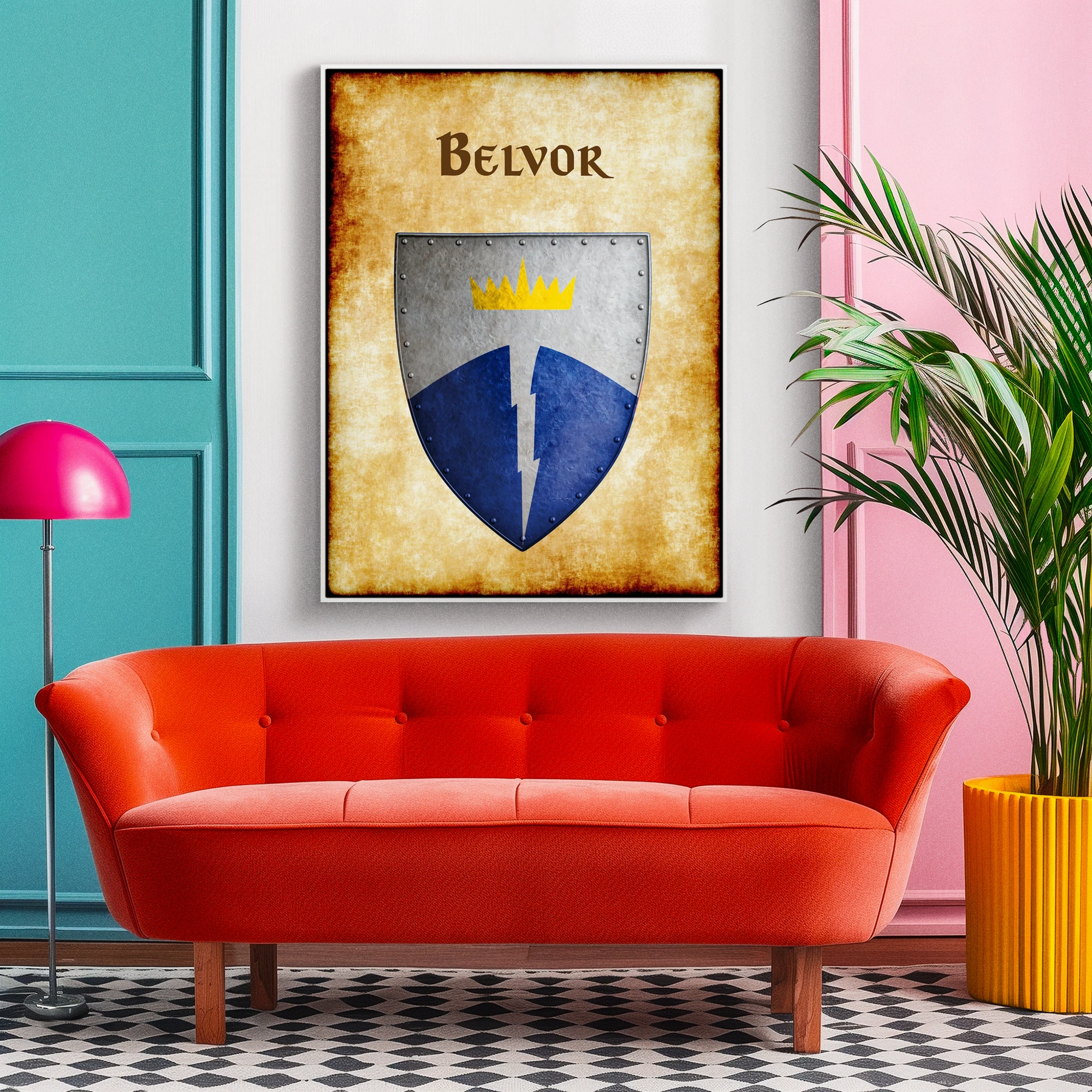 A heater shield divides per chevron: argent above, azure below, crowned at the join. This belvor Greyhawk heraldry canvas print bears a silver lightning bolt descending through blue field. The riveted metal border frames blackletter typography spelling BELVOR, notably rendered against aged parchment.