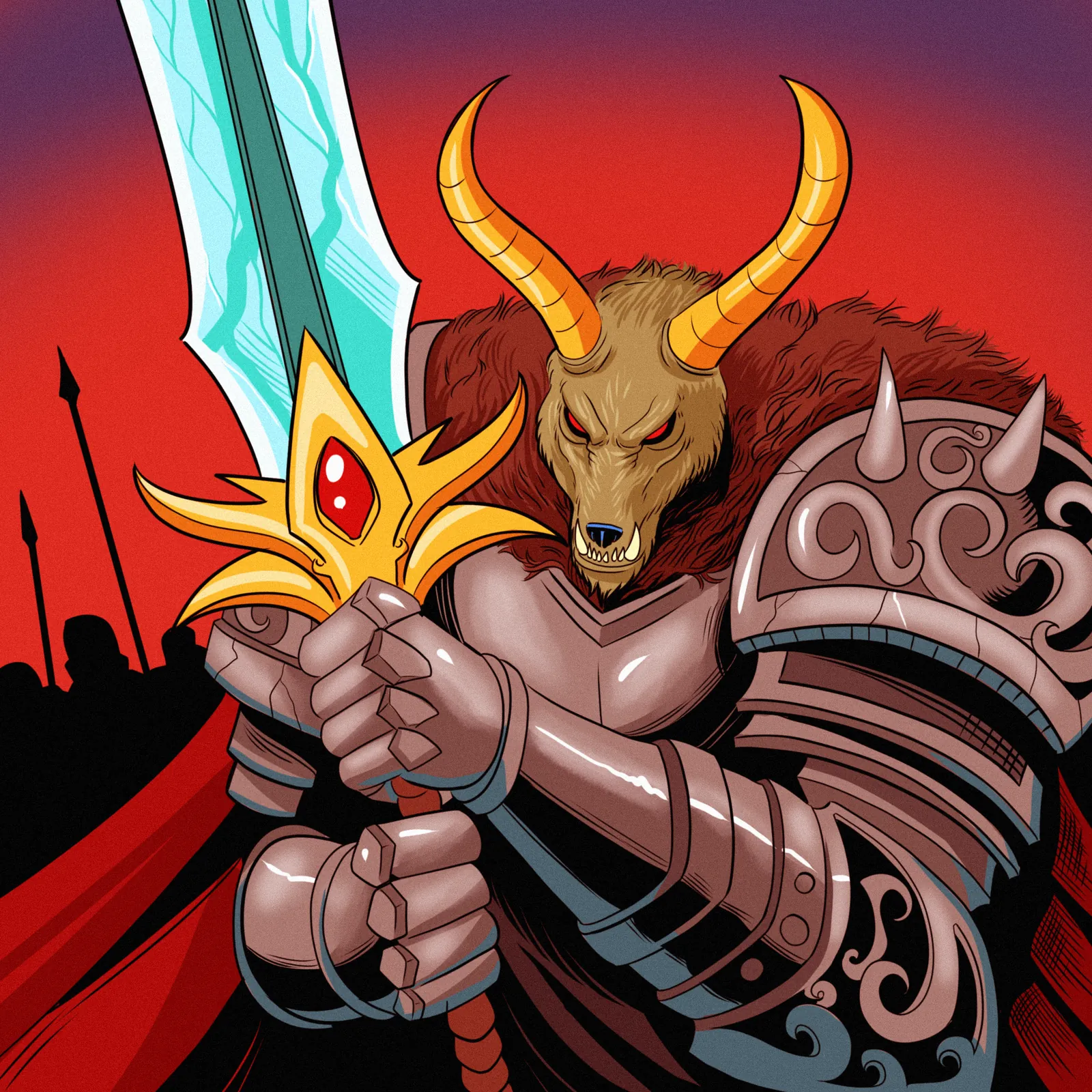 Additionally, the color palette shifts from deep crimson at the base to rich purple above. The pale cyan blade contrasts sharply against the warrior’s tan fur and bronze plating. Indeed, black silhouettes of an army create depth in the lower left corner.