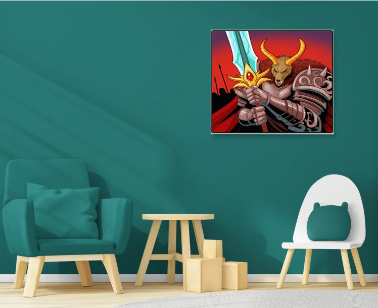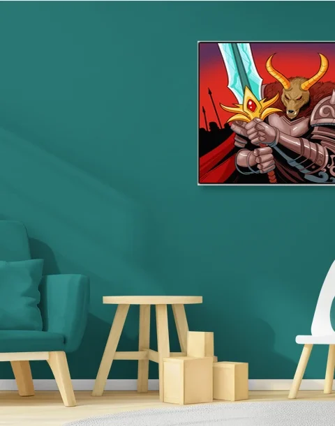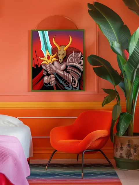 Display this in a gaming room where the aggressive composition reinforces competitive energy. Additionally, the piece works particularly well alongside other warrior-themed fantasy illustrations.