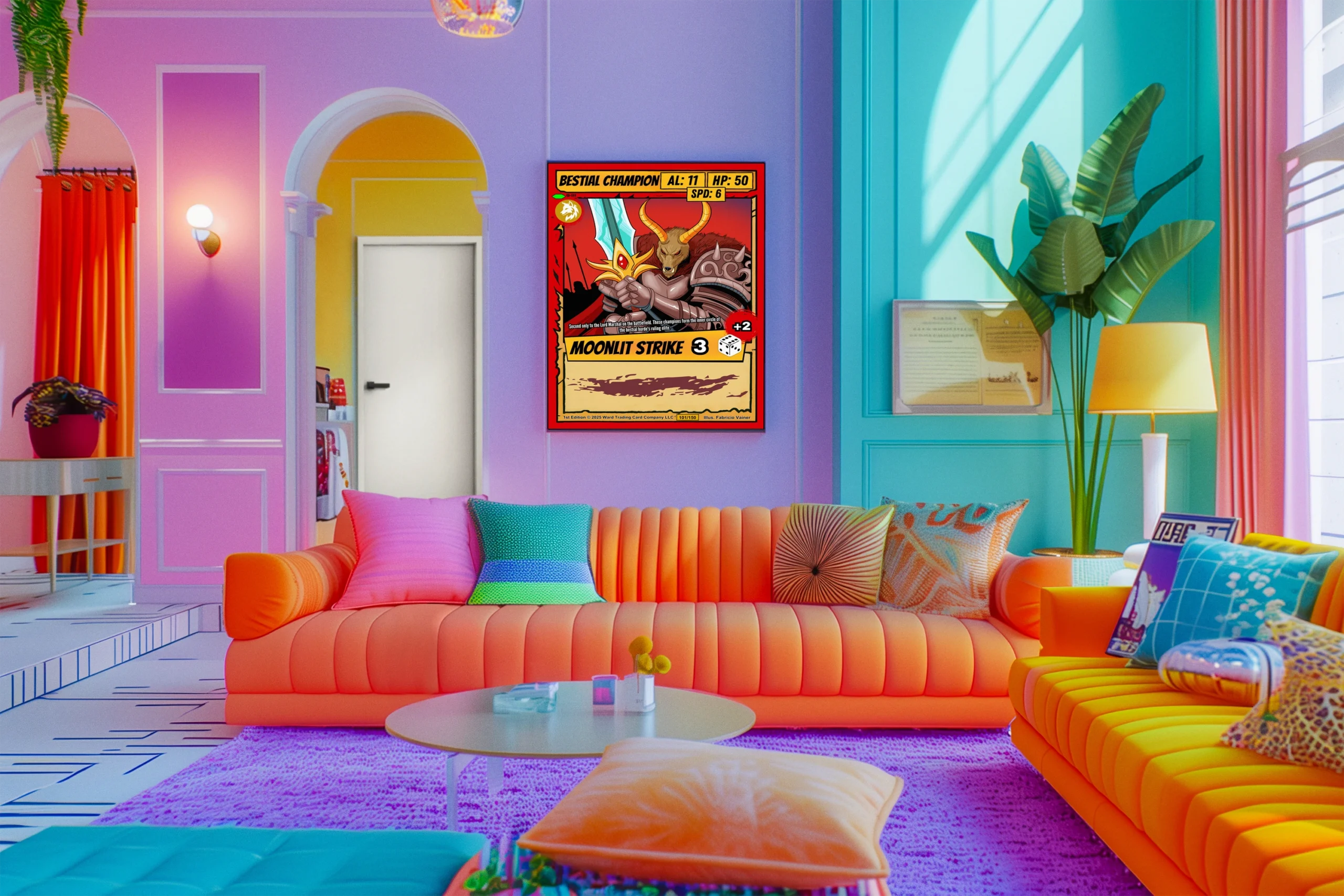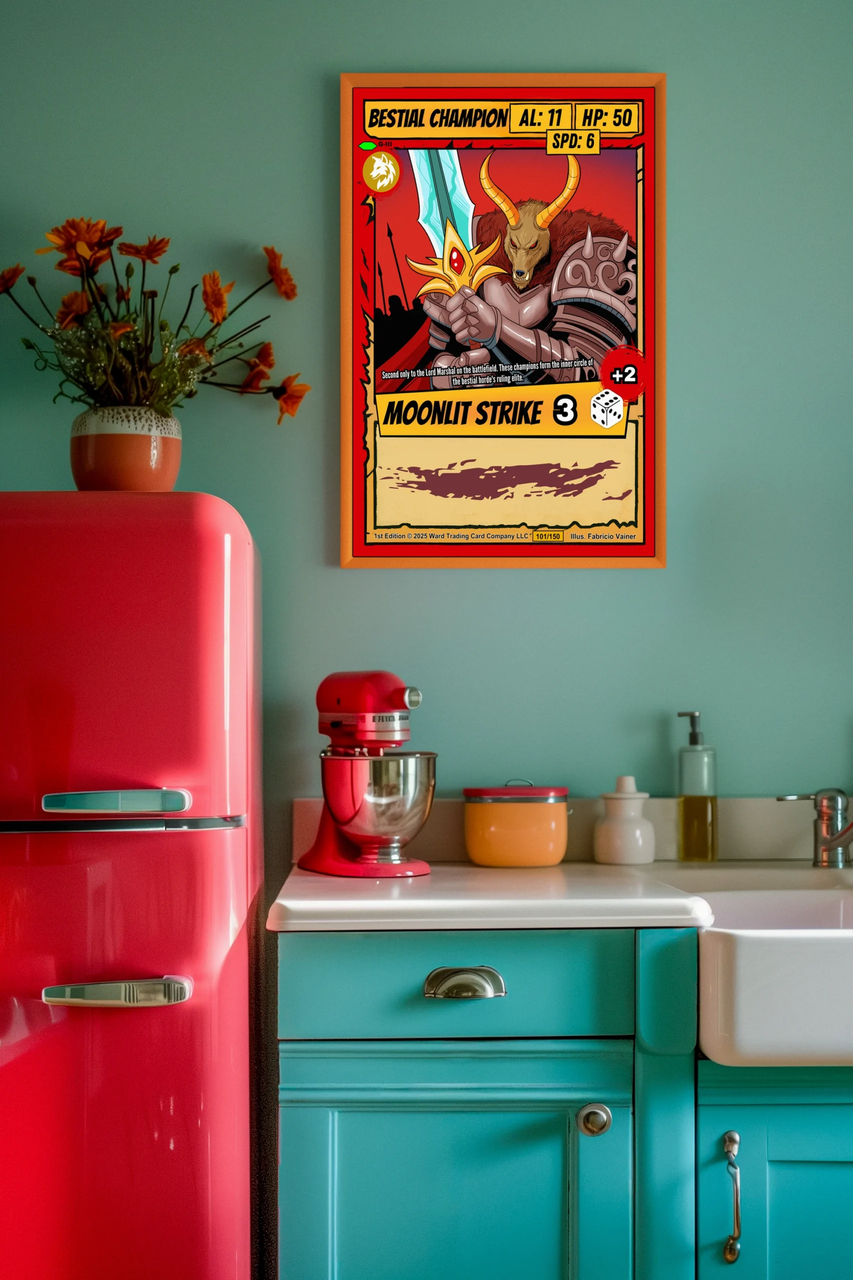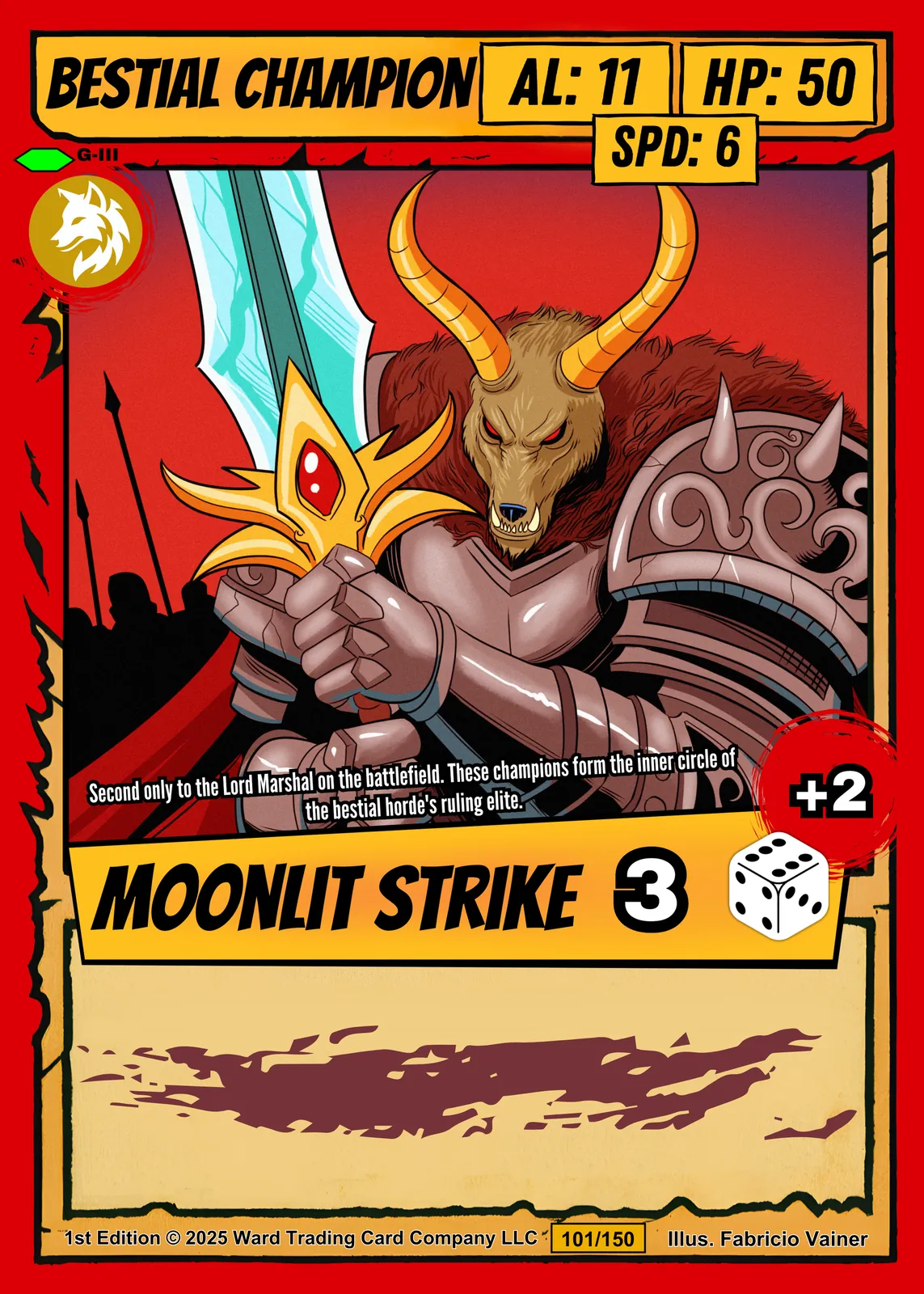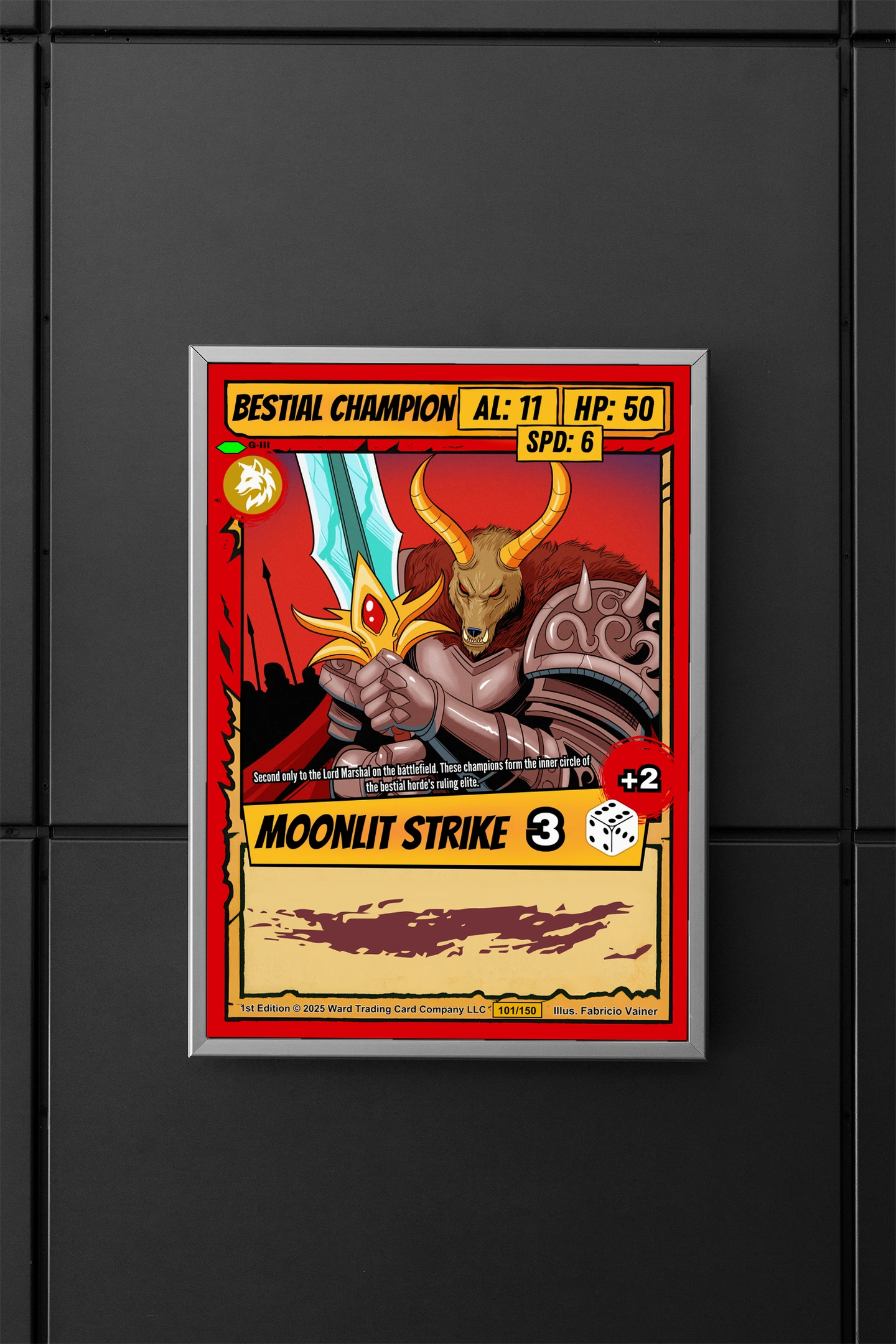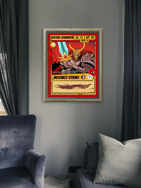 Additionally, authentic card elements remain faithfully preserved in stunning clarity. Bold red borders frame yellow banners displaying stats like AL: 11 and HP: 50. The wolf emblem badge and MOONLIT STRIKE 3 ability add genuine collectible appeal.