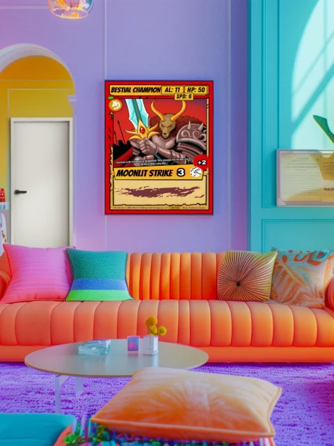 At display scale, those spiraling tribal armor patterns and bronze pauldrons command impressive presence. The crimson sky backdrop with silhouetted flags creates dramatic atmospheric depth. Your bestial champion trading card canvas print becomes an instant focal point in any space.