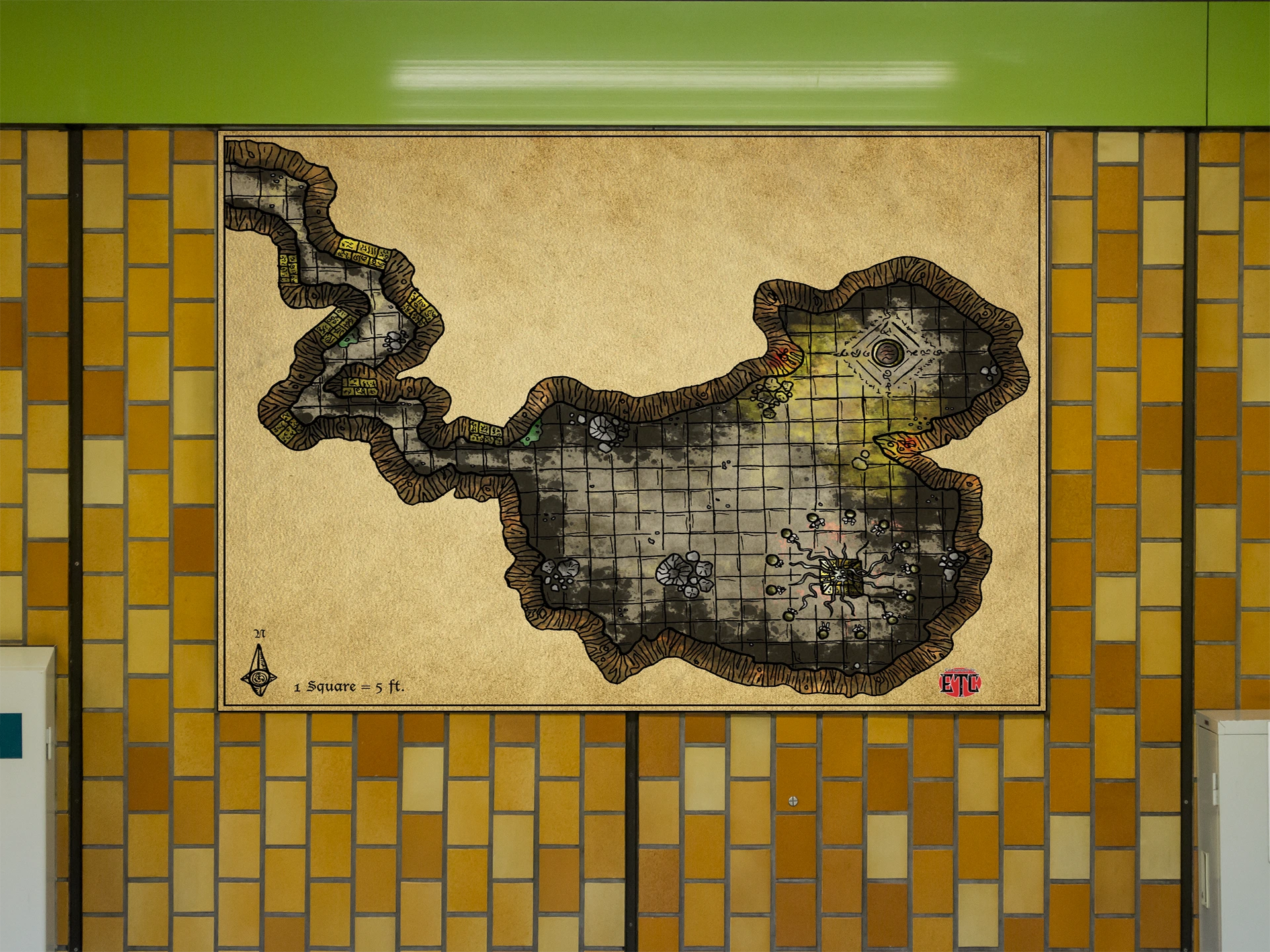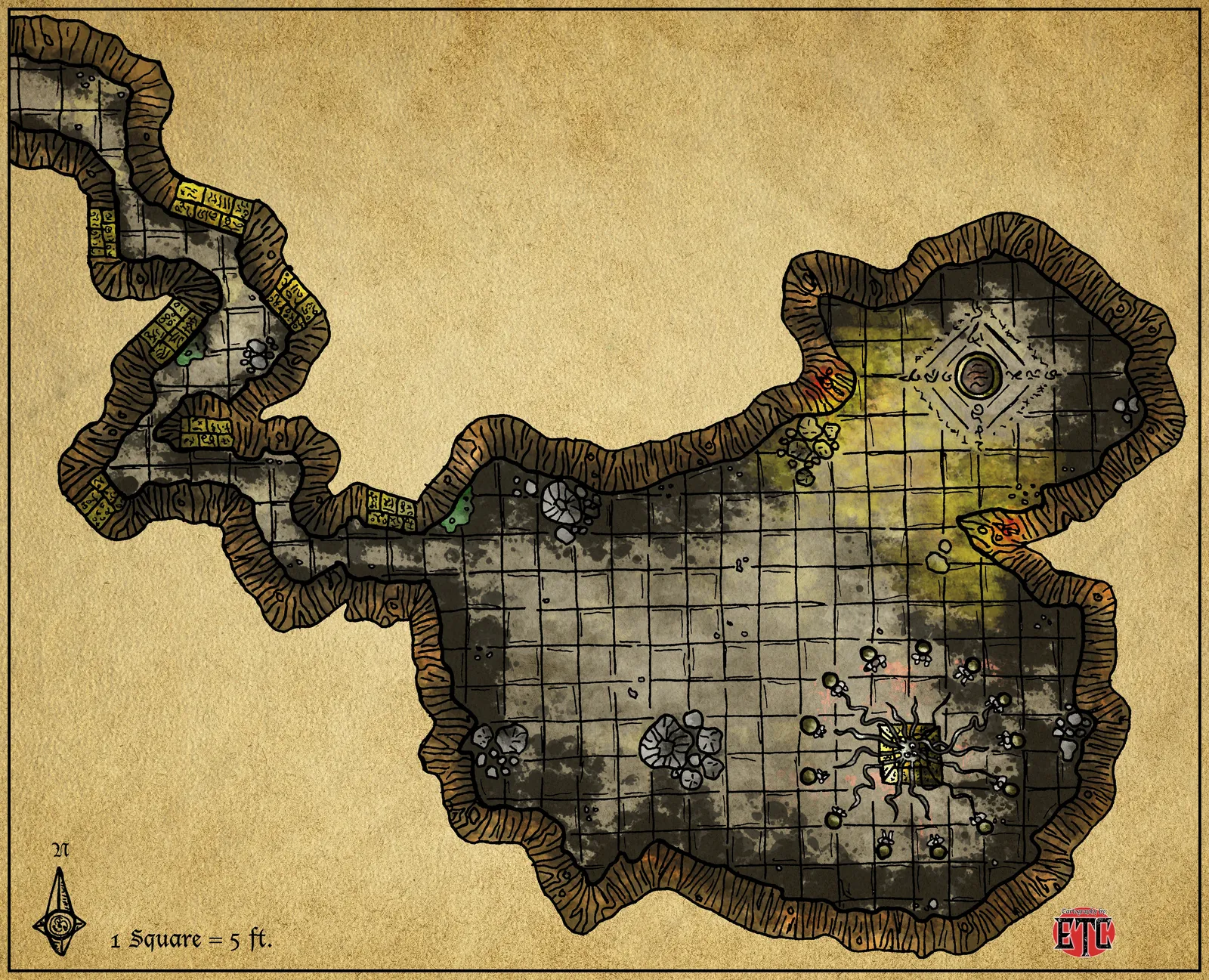 Underground chambers branch across aged parchment in hatched stone and tan cavern walls. This bewitched altar fantasy battle map canvas print shows a gridded dungeon system with mushroom-filled rooms and labeled corridors. The compass rose marks ‘1 Square = 5 ft.’ in the bottom corner, notably grounding the scale.