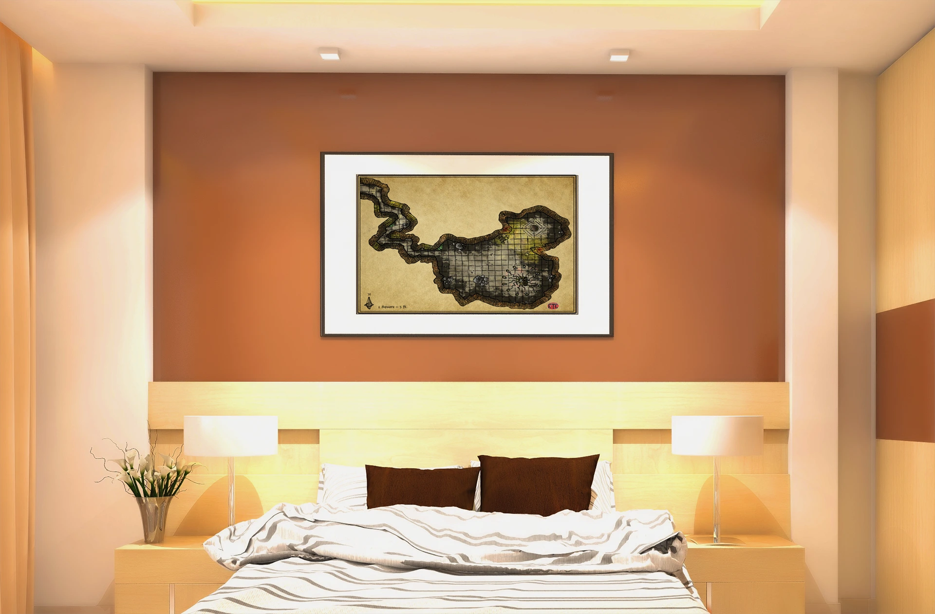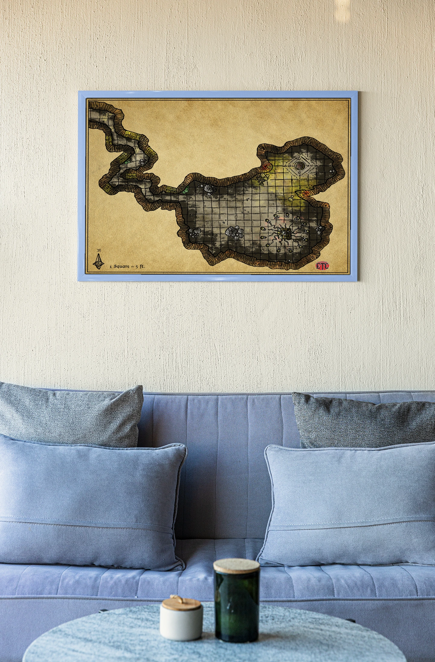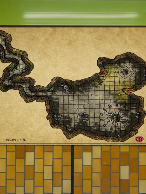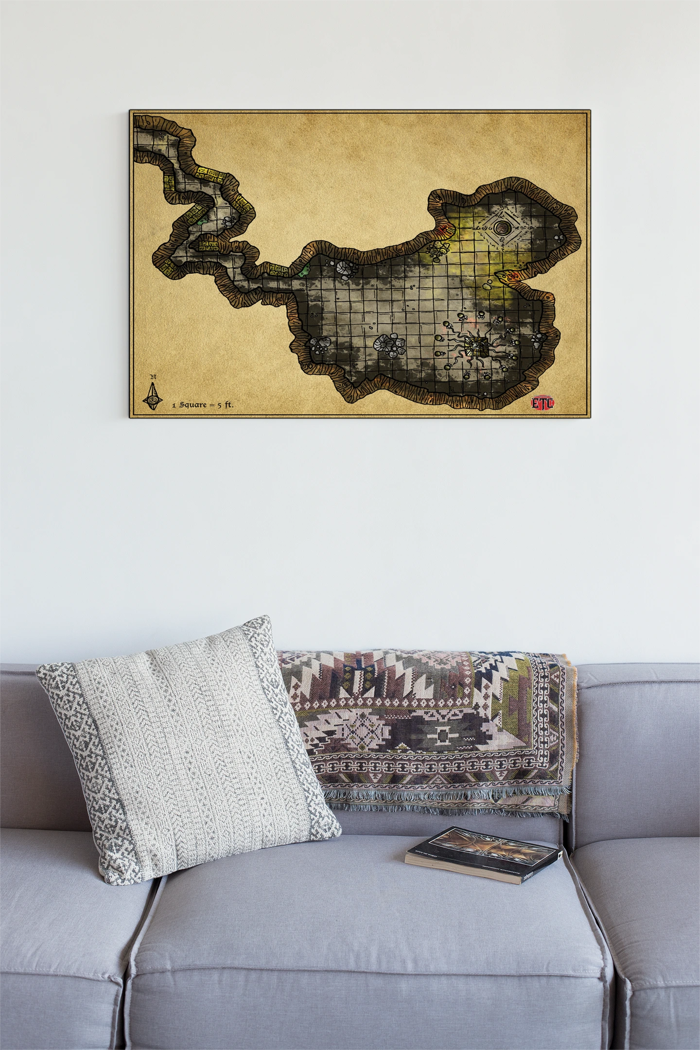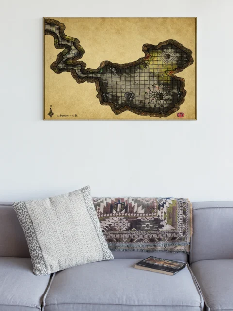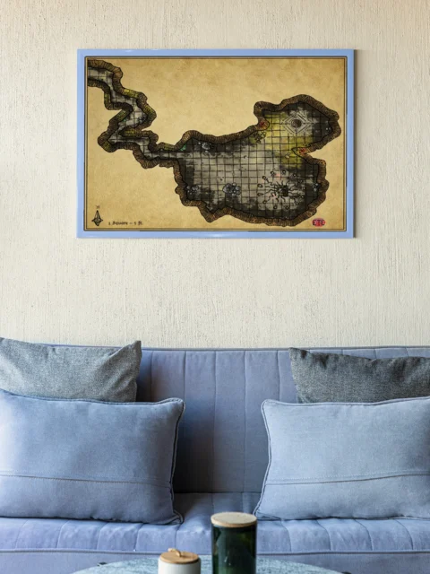Study or library walls benefit from this gridded reference when designing multi-chamber dungeon crawls or ritual encounters. The parchment aesthetic, moreover, pairs naturally with campaign notes and worldbuilding journals on nearby shelves.