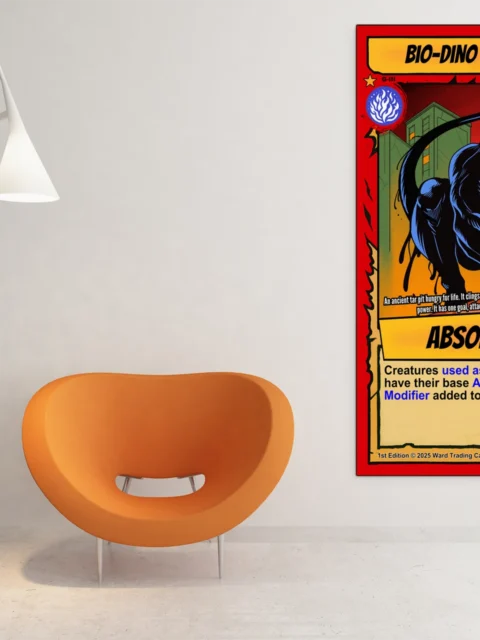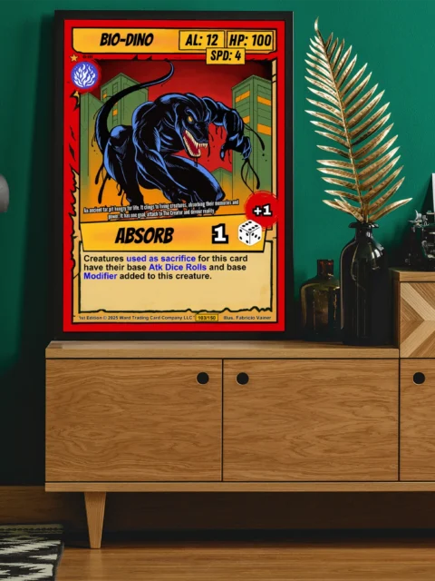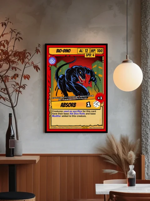 The yellow ability banner reads ‘ABSORB’ with a dice icon showing value 1. At room scale, the heavy black linework and high-contrast color scheme command attention from across the space. Collectors seeking bio dino trading card canvas print artwork recognize the Gen 3 card layout and menacing creature design.