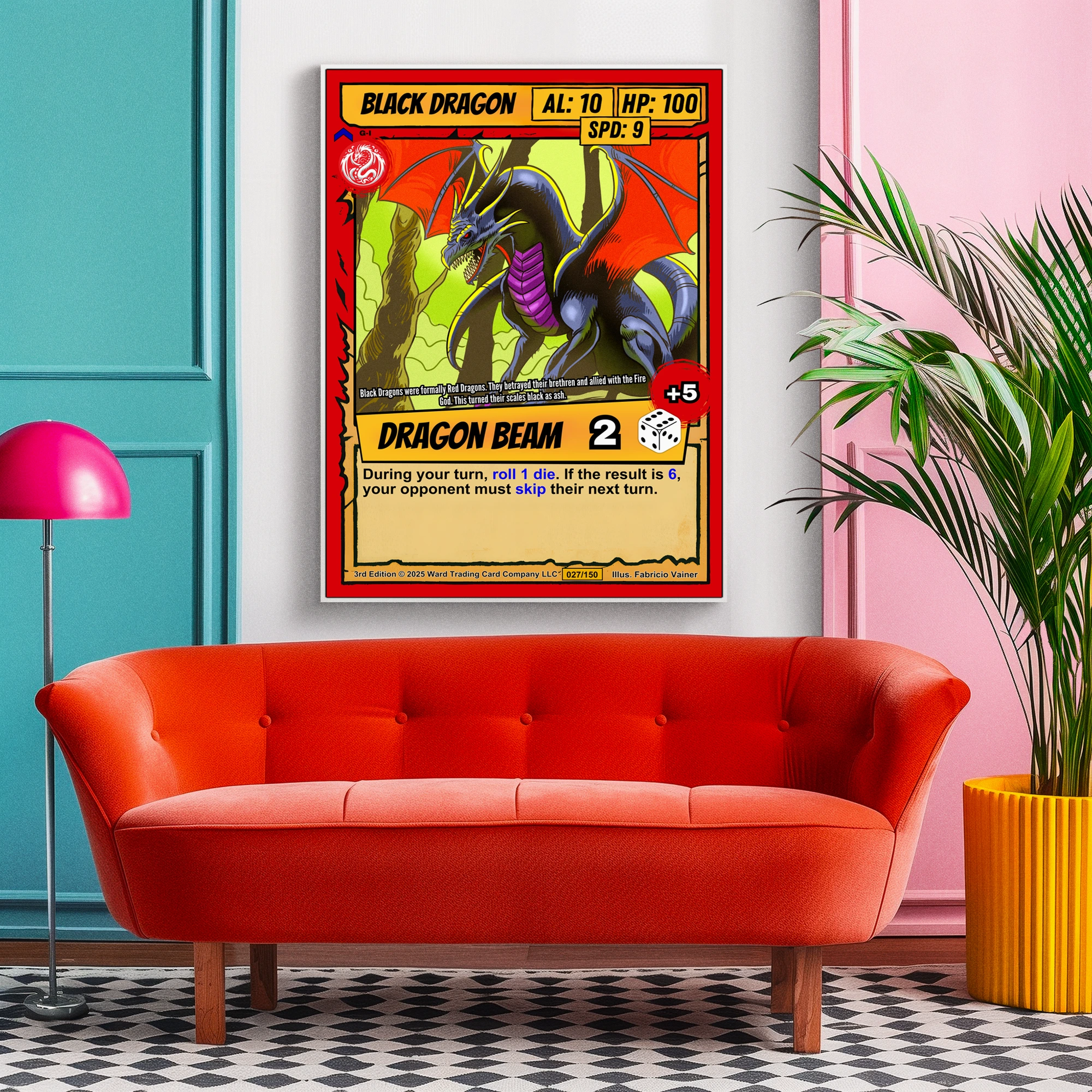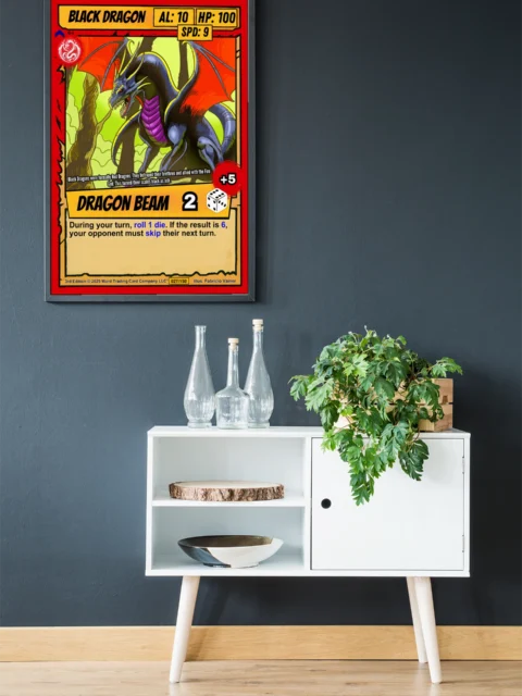 That +5 modifier in the corner signals serious damage potential to any TCG player. Collectors recognize Ward’s dice-based combat system and Vainer’s signature style immediately. This black dragon trading card canvas print particularly appeals to players who appreciate both game mechanics and fantasy art.