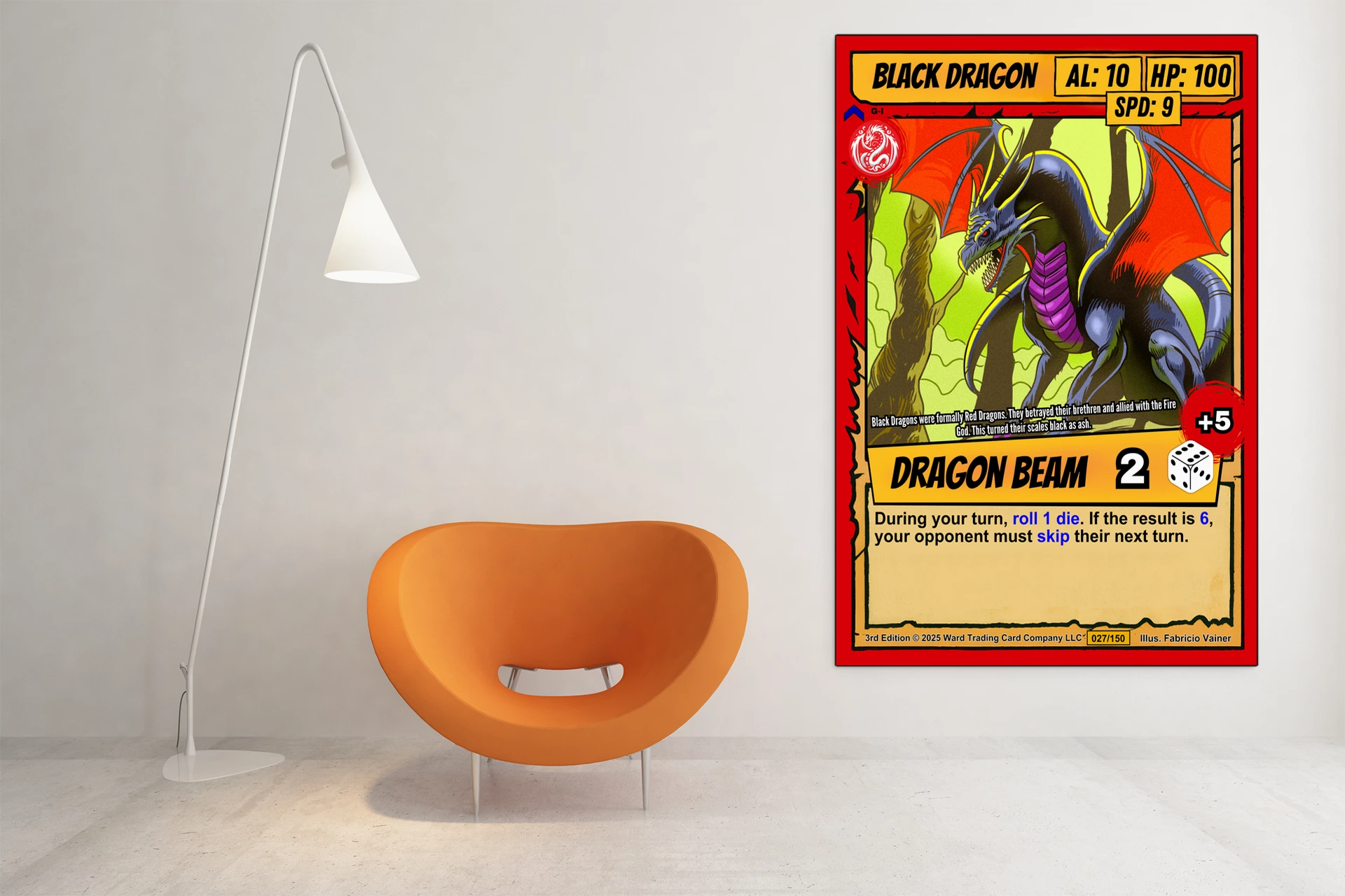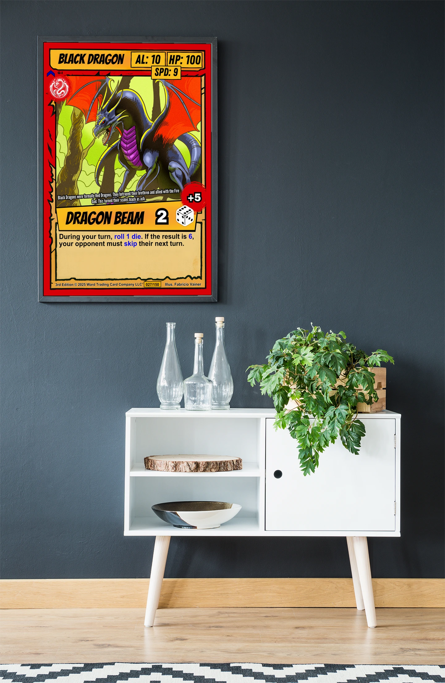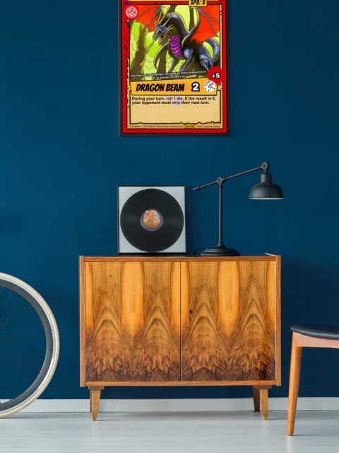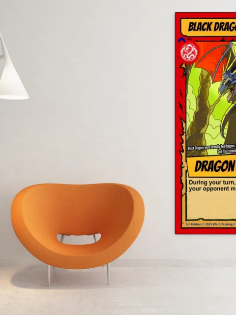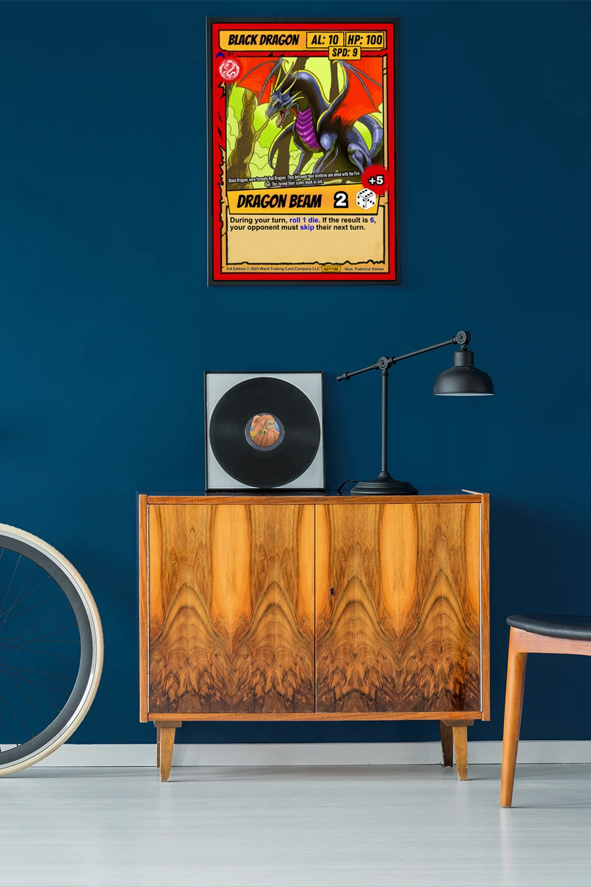 Game rooms gain focus when this menacing dragon oversees sessions framed above a gaming table. The card format specifically reminds players of Ward’s no-deck-building combat system.