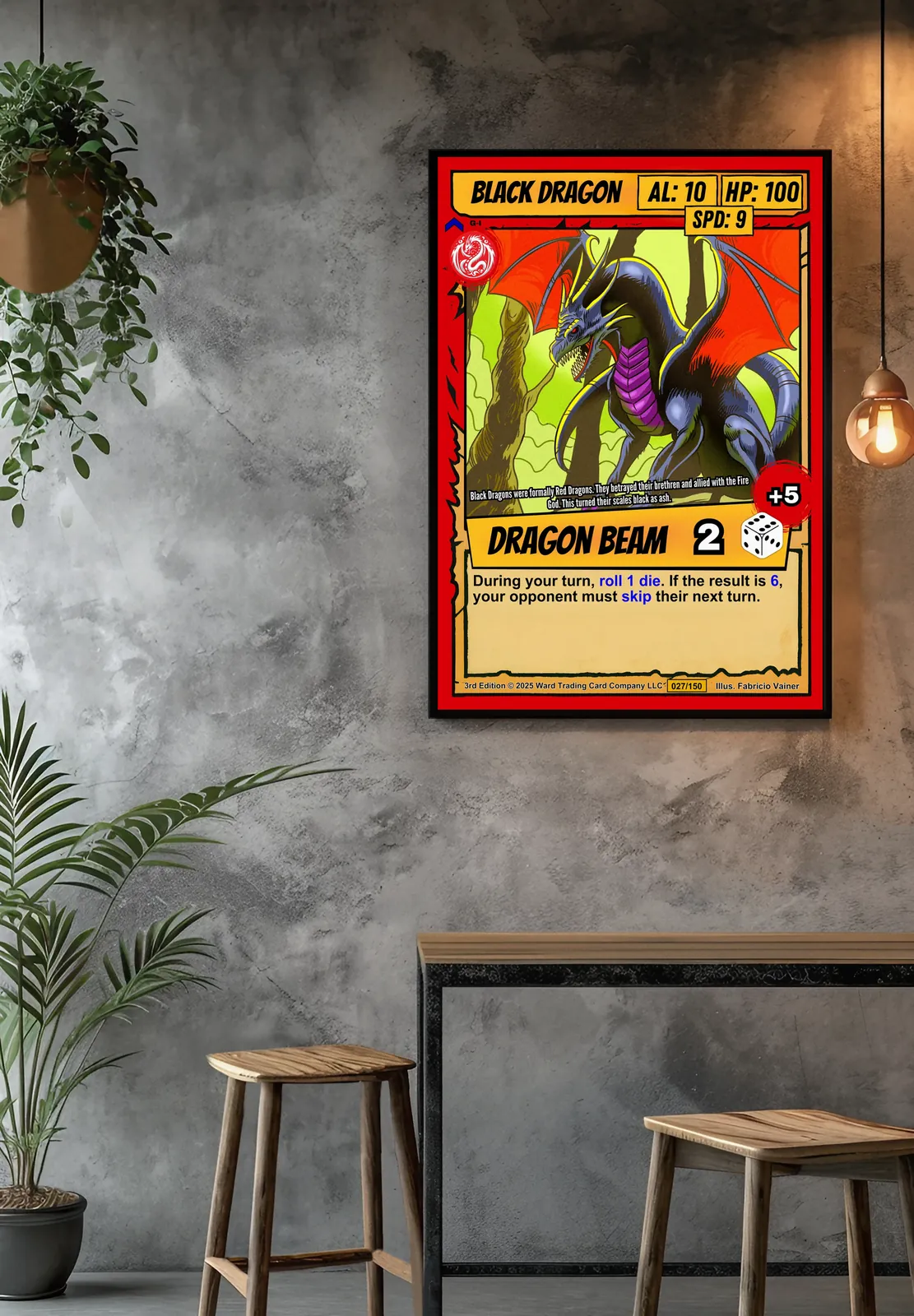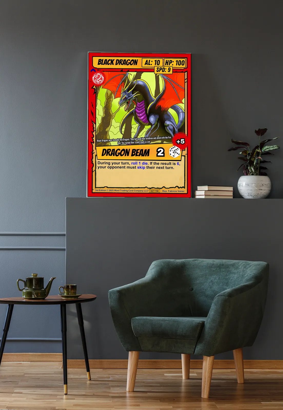 This works in game rooms where bold color and menacing creatures set the tone. Additionally, it anchors spaces where trading card nostalgia meets display-worthy art.