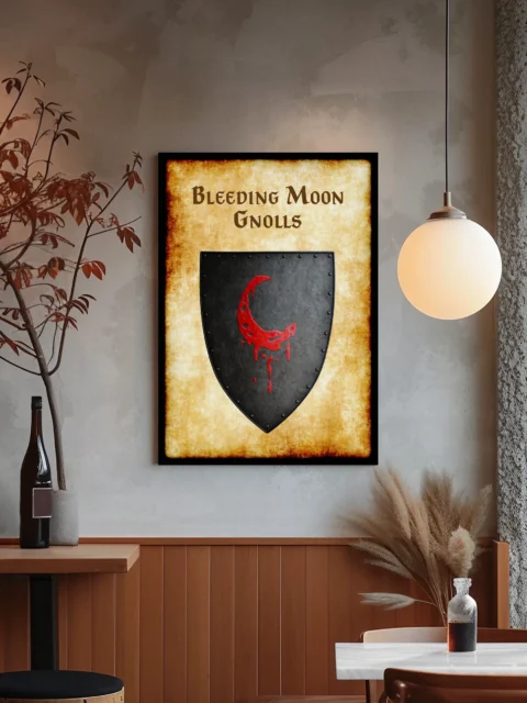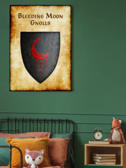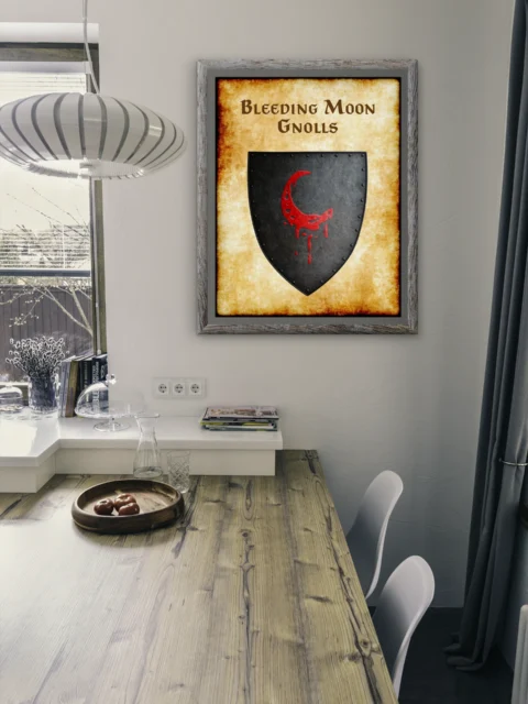 A blood-red crescent moon drips crimson against hammered black iron. This bleeding moon gnolls Greyhawk heraldry canvas print displays weathered medieval craftsmanship. Notably, riveted edges frame the ominous lunar charge.