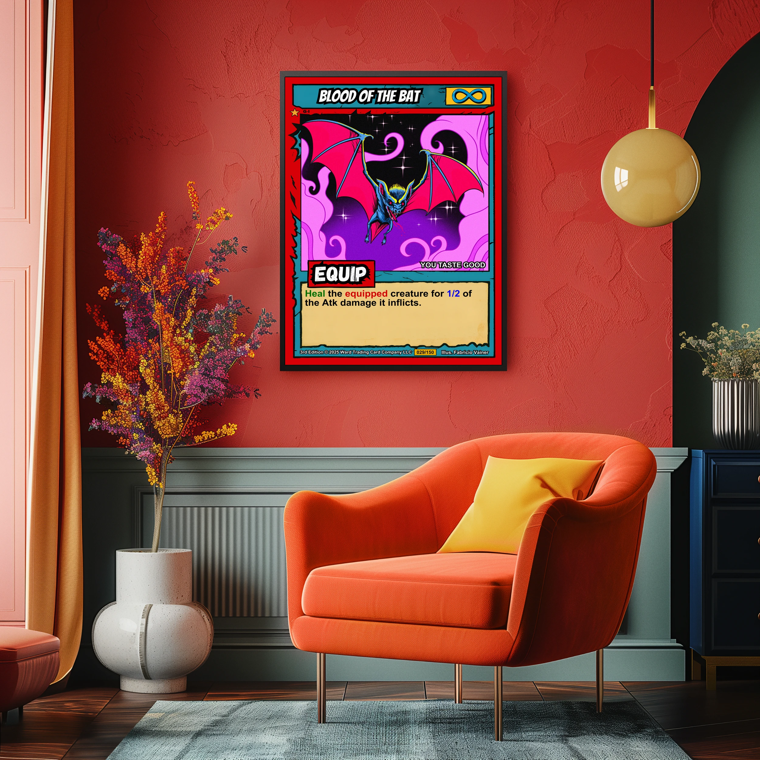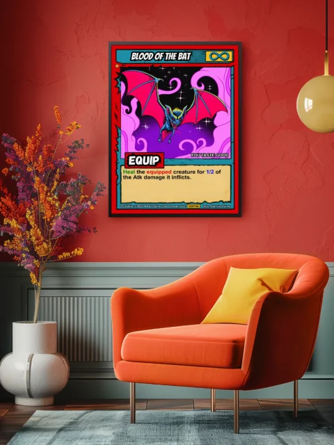 Dungeon masters place supernatural encounters that demand memorable visuals. TCG collectors appreciate Fabricio Vainer’s distinctive 1990s comic book illustration style. Particularly, this blood of the bat trading card canvas print captures Ward TCG’s bold fantasy aesthetic.