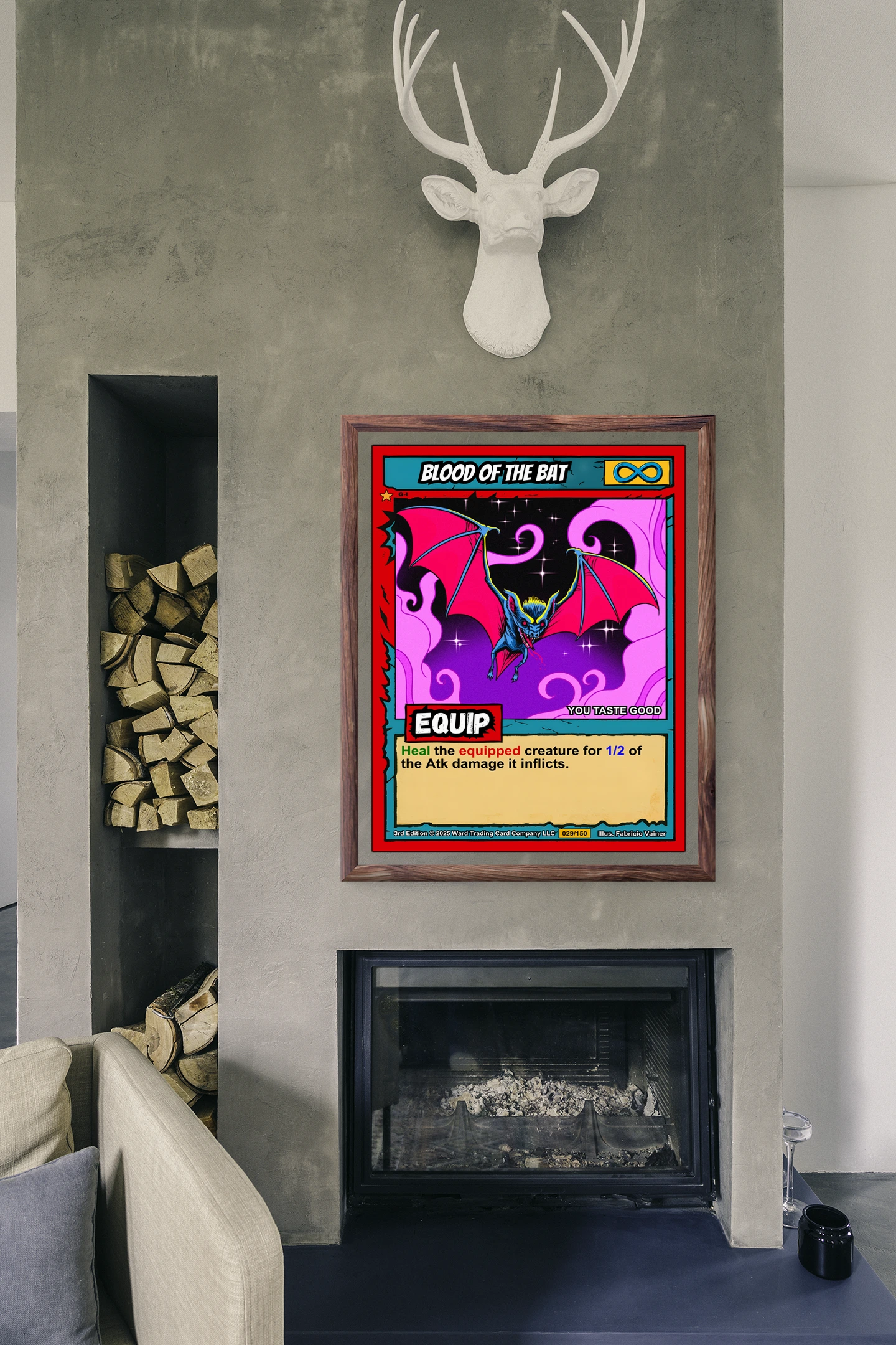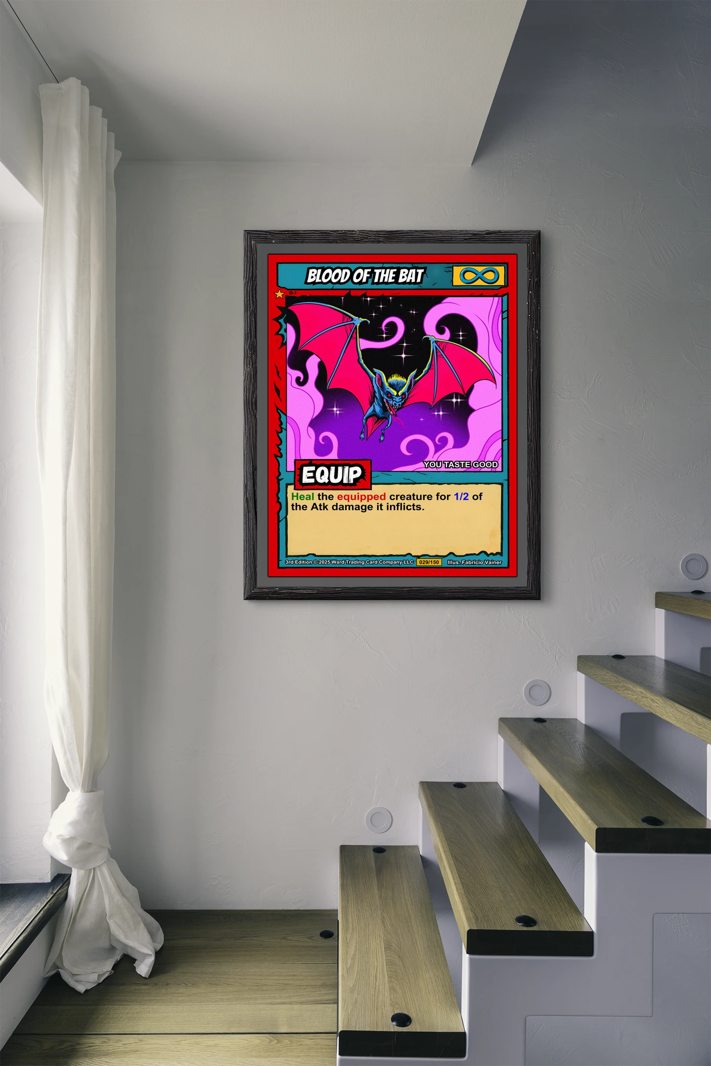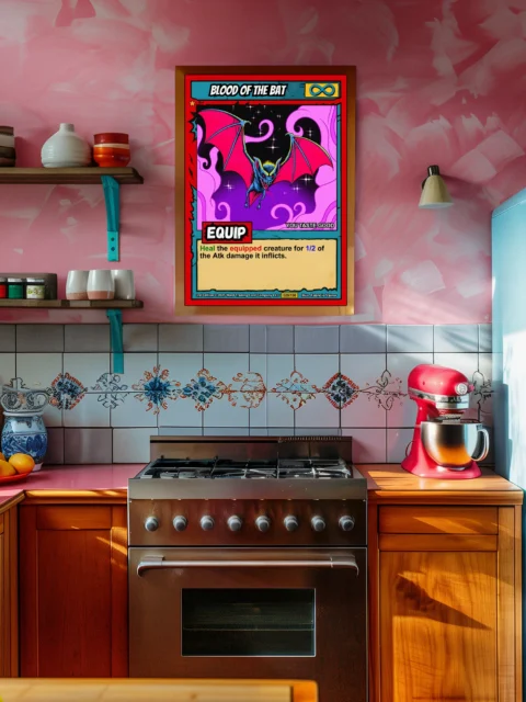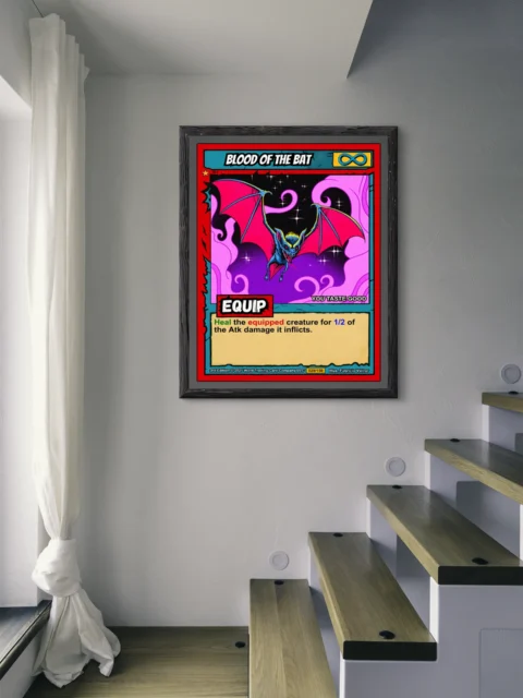 Collector walls alongside other fantasy art prints benefit from Ward TCG’s distinctive aesthetic. Indeed, the supernatural bat creature complements other trading card game artwork perfectly.