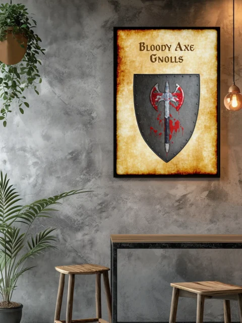 Gnoll warbands inspire dread across the Flanaess wilderness regions. Greyhawk collectors recognize the savage militaristic culture these raiders represent. Moreover, this bloody axe gnolls Greyhawk heraldry canvas print declares your OSR credentials.
