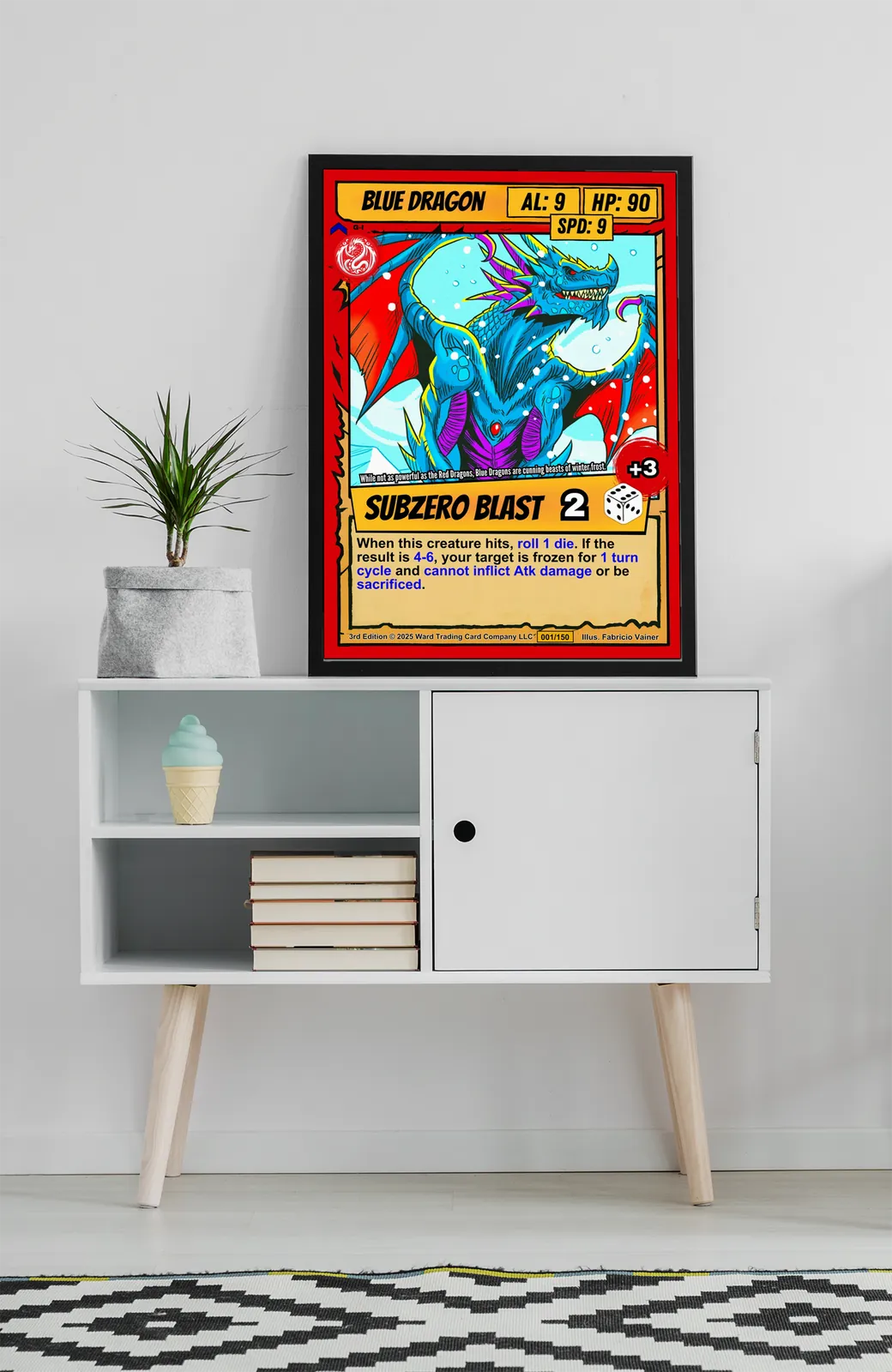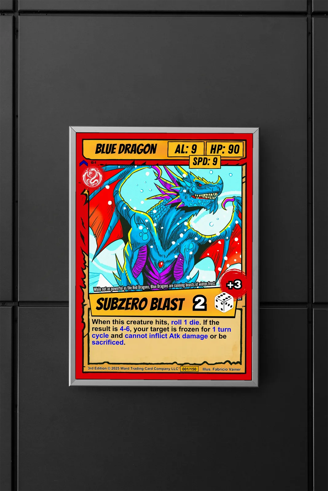 At room scale, the bold black outlines and cel-shading read clearly from across the space. Trading card collectors recognize the classic Ward layout immediately. This blue dragon trading card canvas print brings the full card design to wall scale.