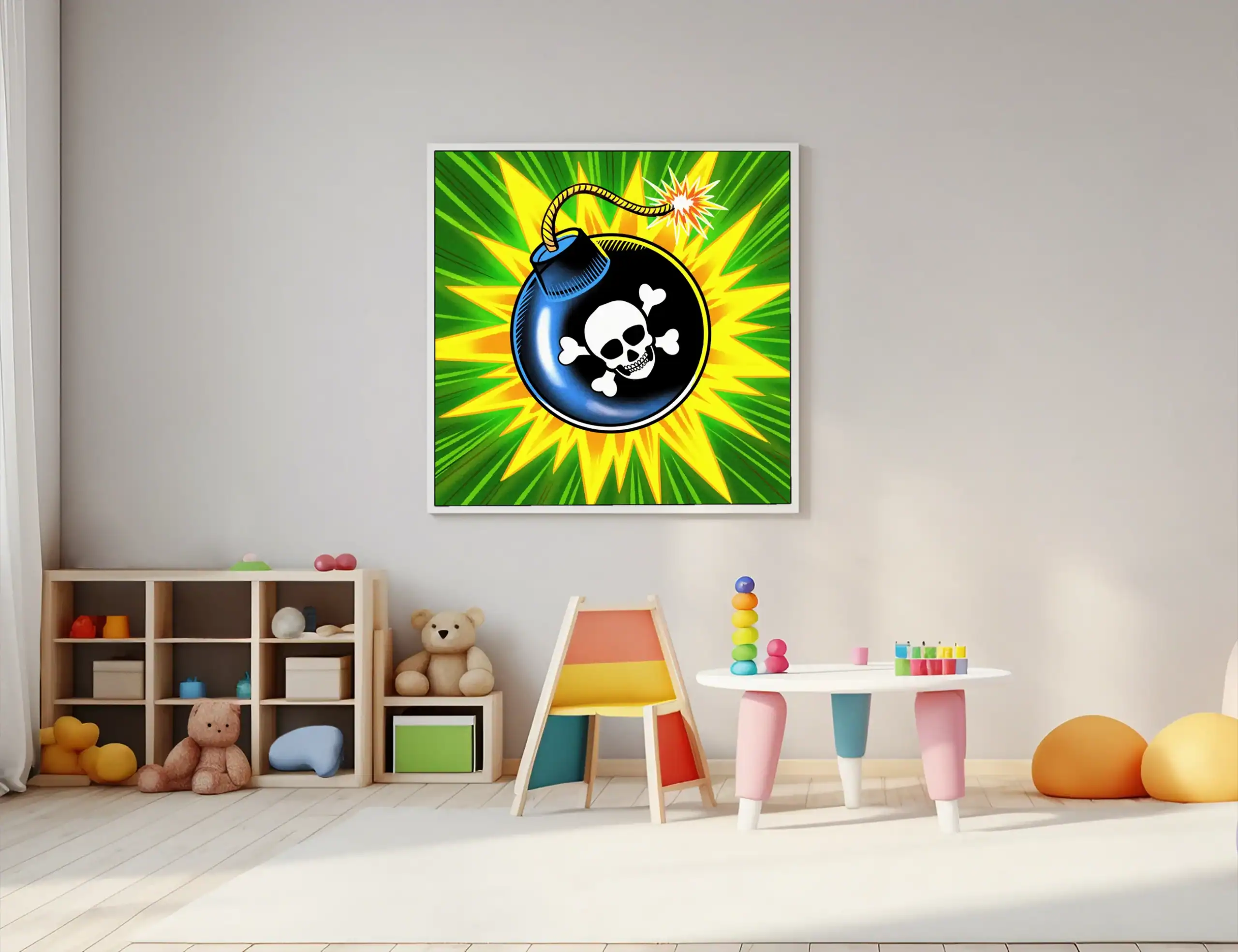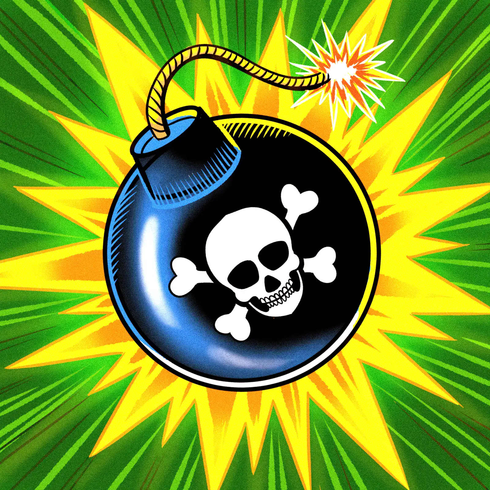 Indeed, jagged yellow burst lines create dramatic explosion patterns around the central bomb. The vibrant green background rays emanate outward in classic comic book style. Moreover, glossy surface highlights in blue define the bomb’s curved form.