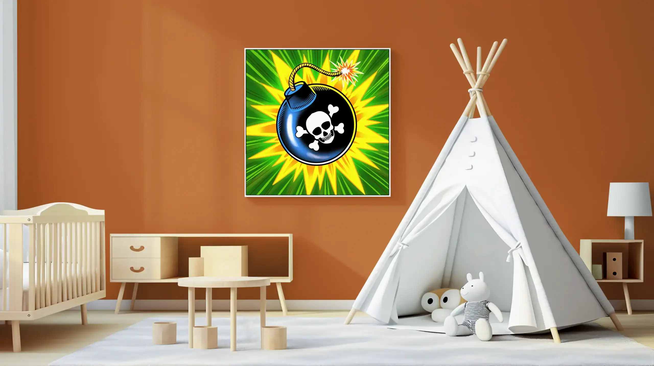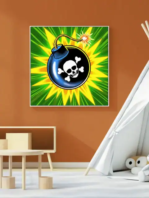 A black spherical bomb dominates the frame with skull and crossbones emblem. This bomb art trading card canvas print showcases Fabricio Vainer’s explosive Ward TCG illustration. Notably, bright orange starbursts radiate from the twisted rope fuse.