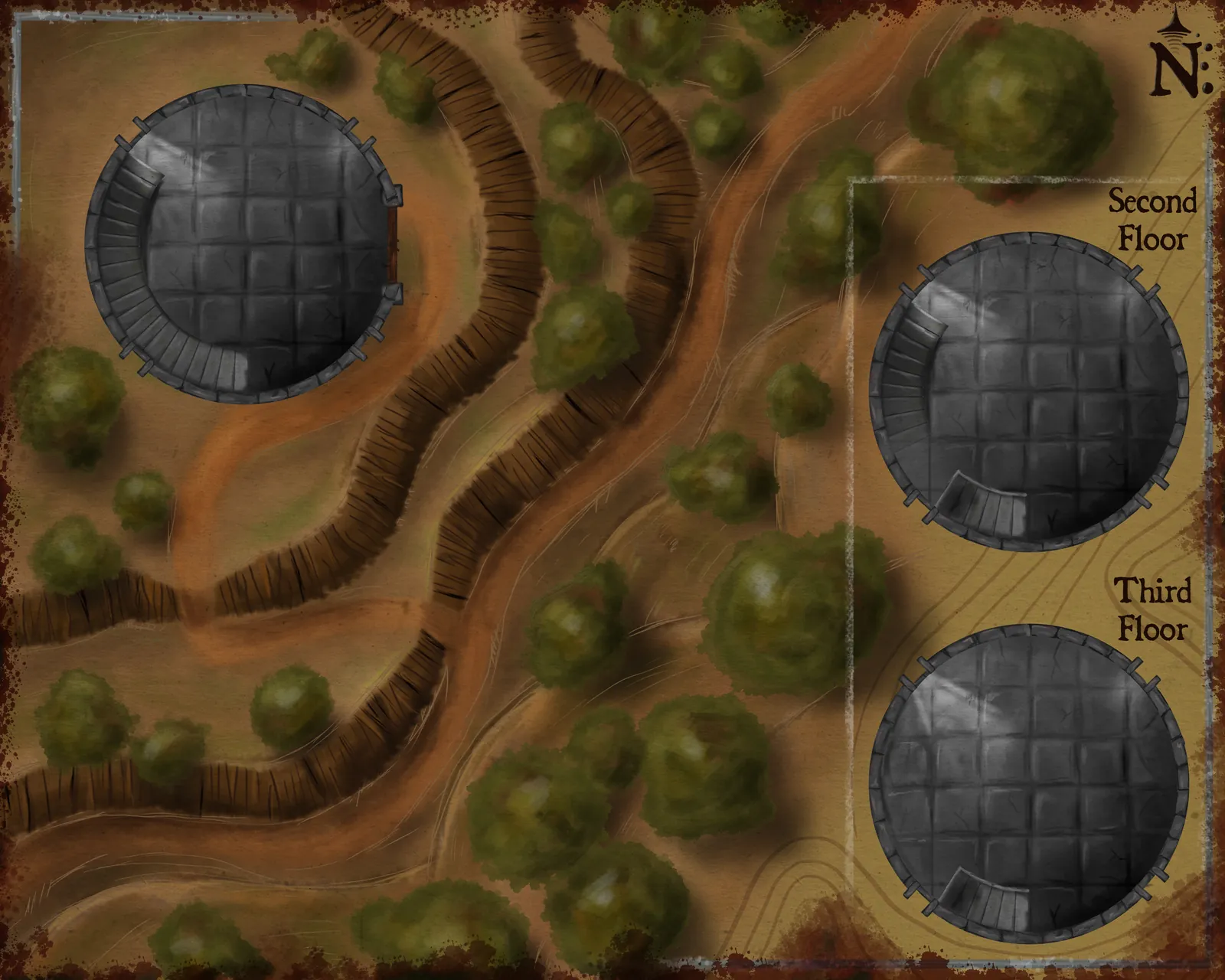 Three circular tower floors occupy the right side with labeled grid interiors. This border tower fantasy battle map canvas print shows wooden palisades enclosing sandy pathways. The palette mixes brown earth tones with muted greens and gray stone.