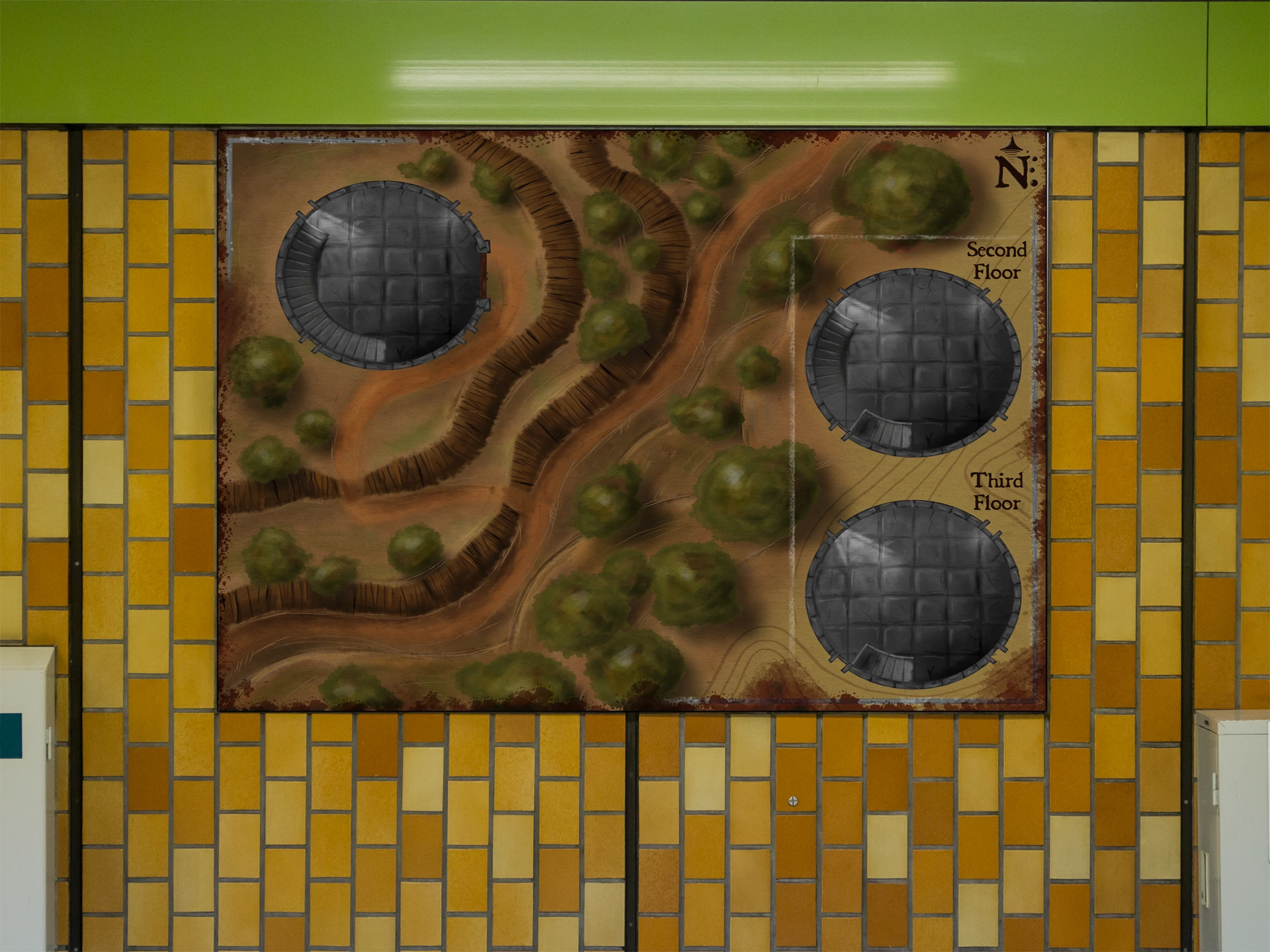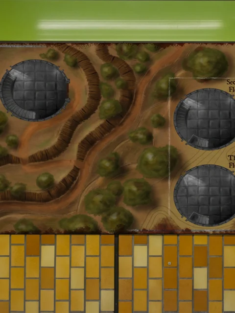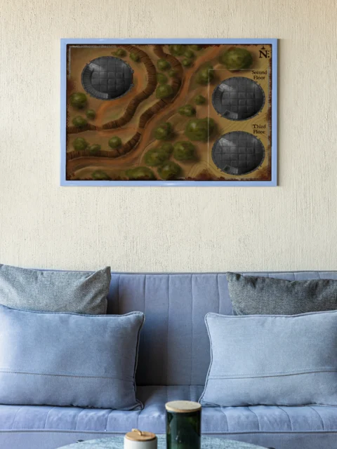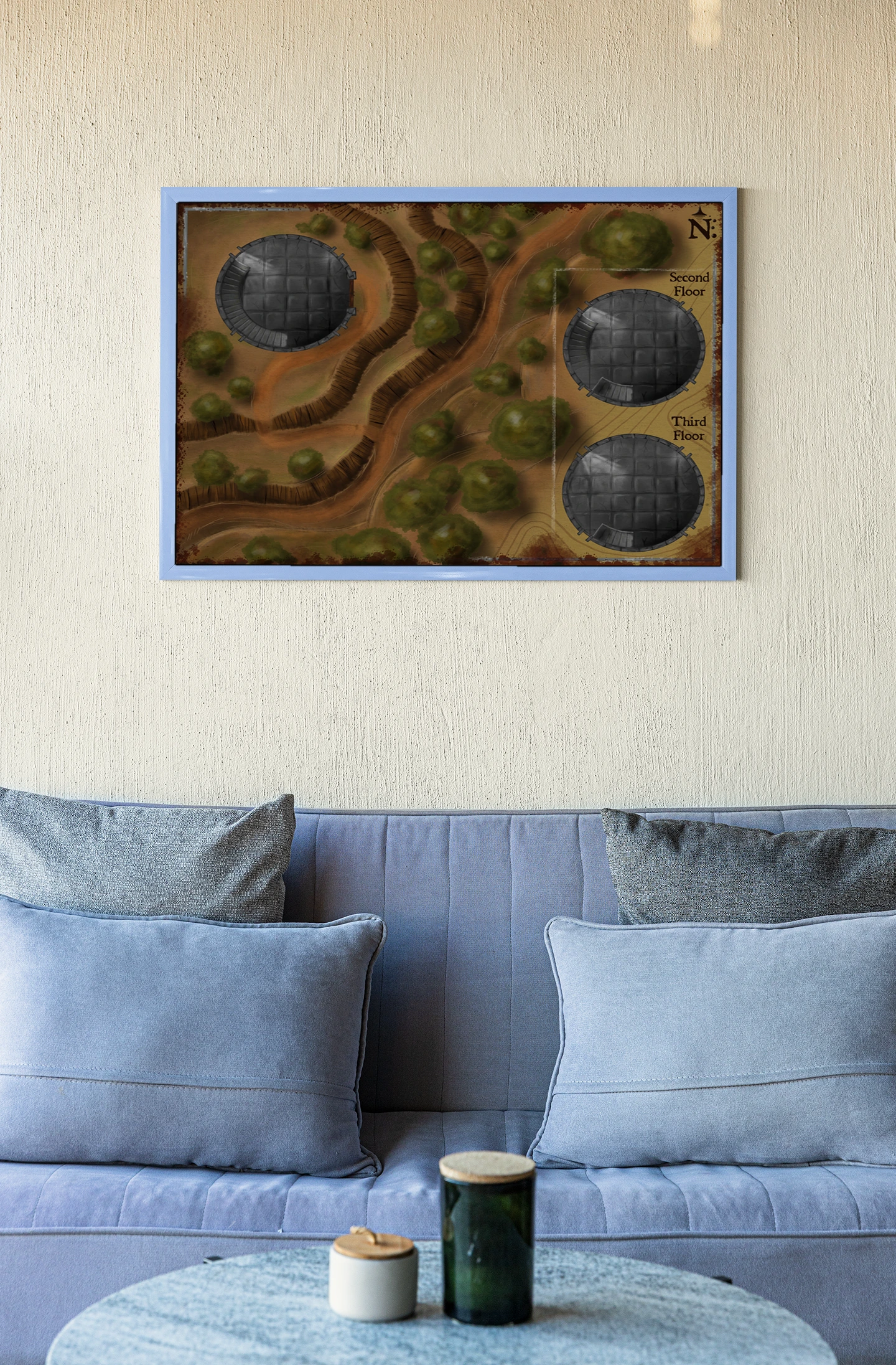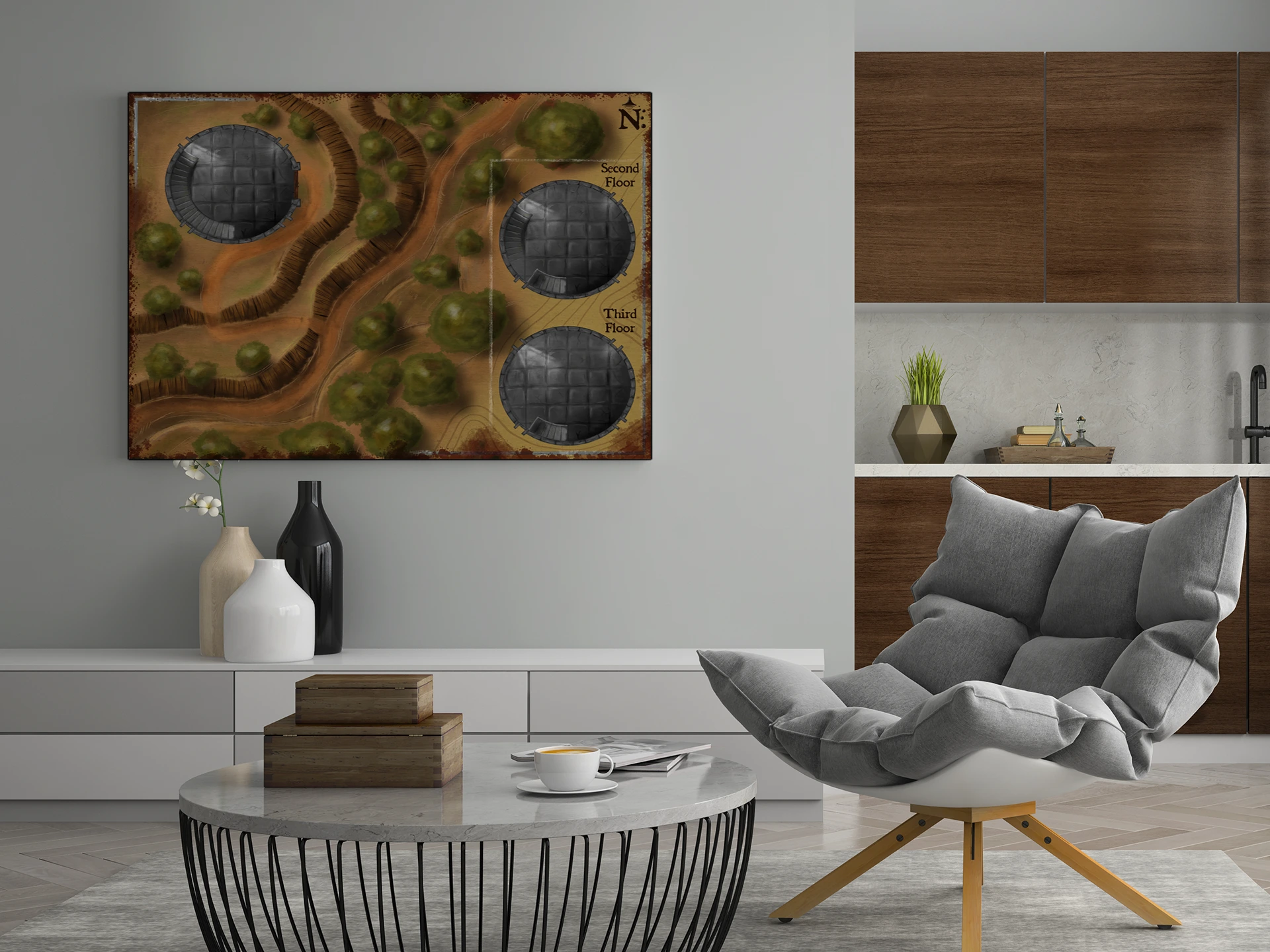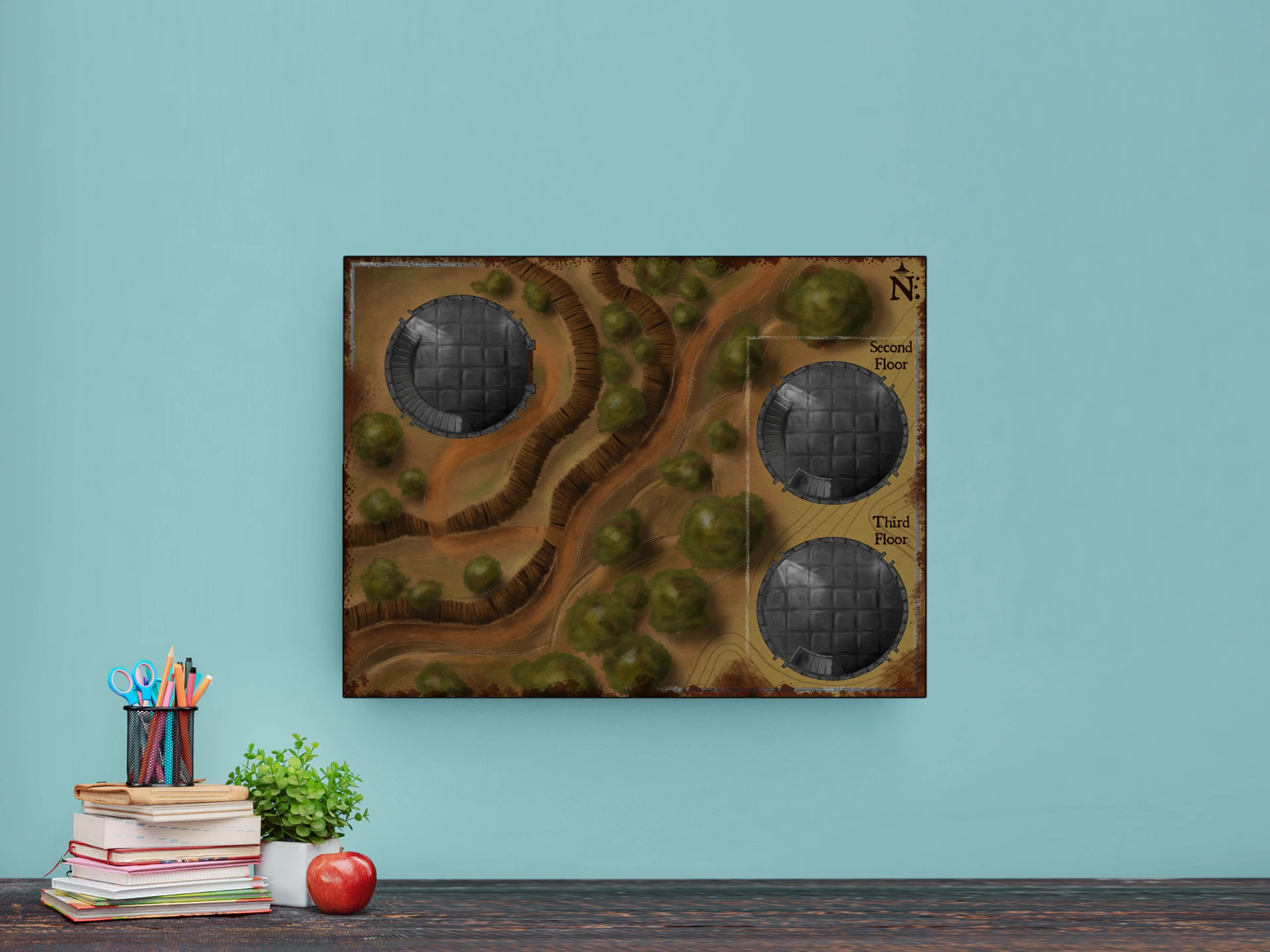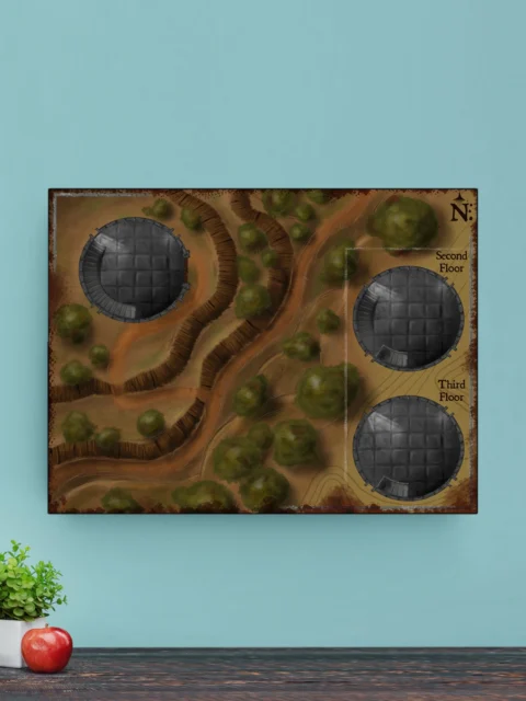 A poster loses the grid detail needed for actual encounter planning. This map serves dungeon masters running frontier defense scenarios or wilderness tower assaults. The border tower fantasy battle map canvas print particularly anchors a workspace built around session prep.