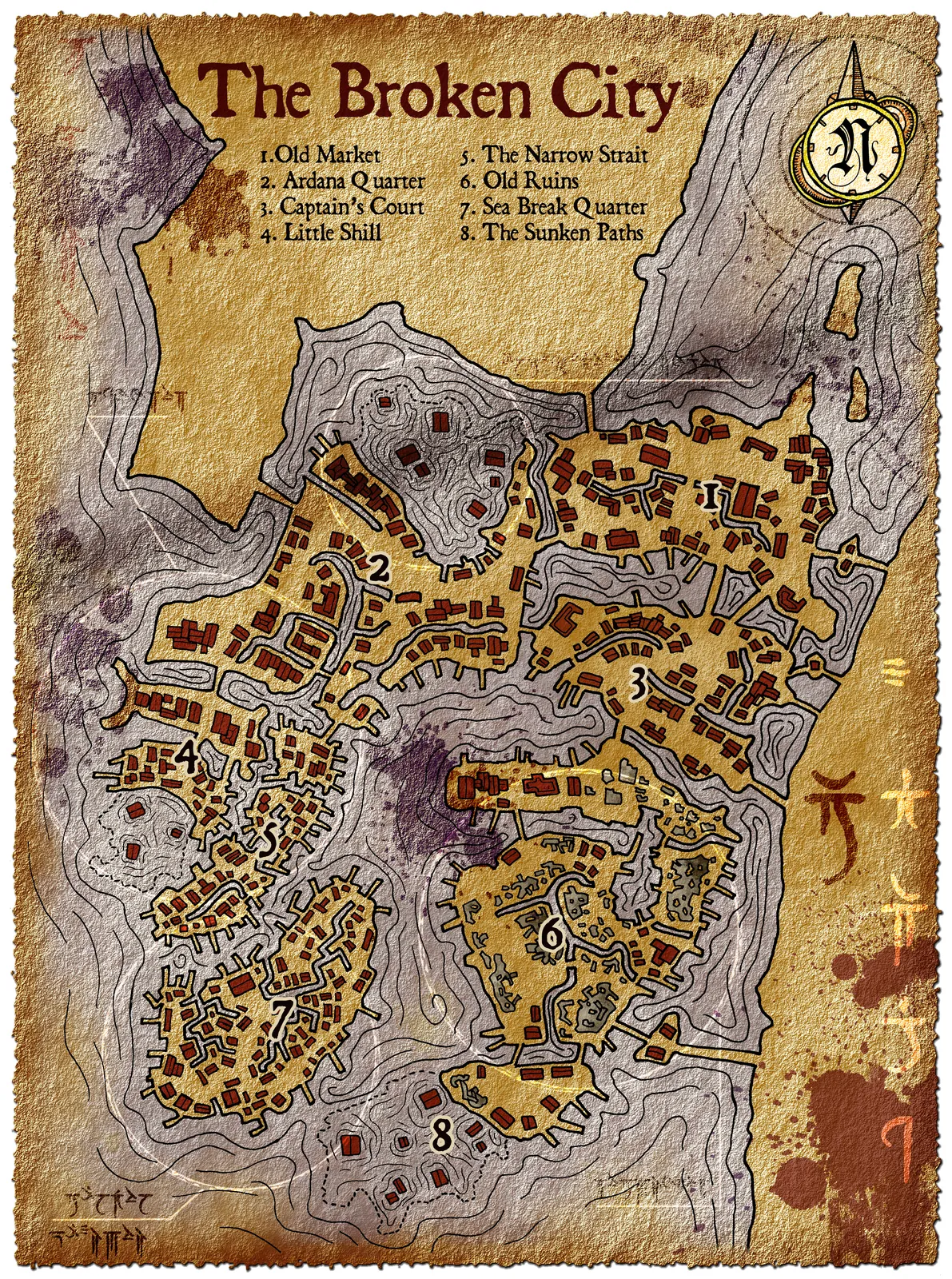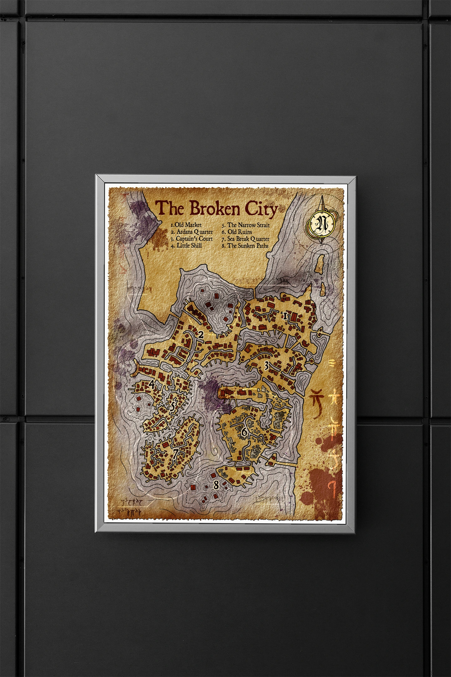 Eight numbered districts spread across aged parchment in red-brown and gray stone. This broken city fantasy battle map canvas print shows a coastal settlement divided by waterways and cliffs. Purple-gray borders frame the Old Market, Ardana Quarter, and Sunken Paths below.