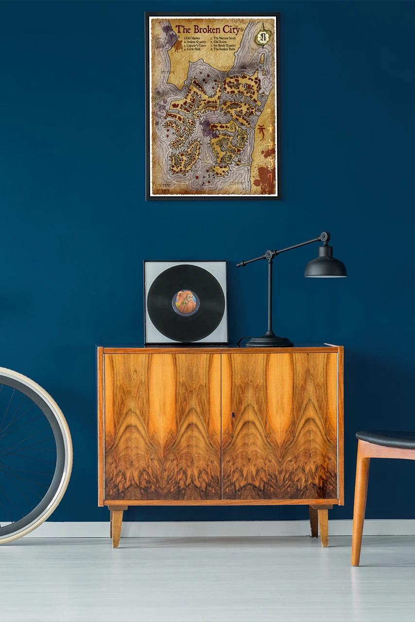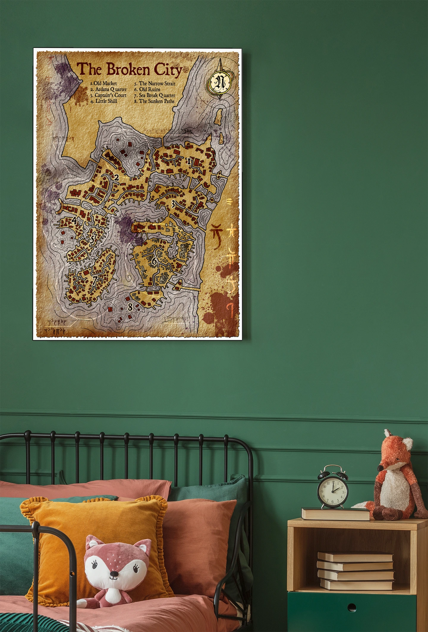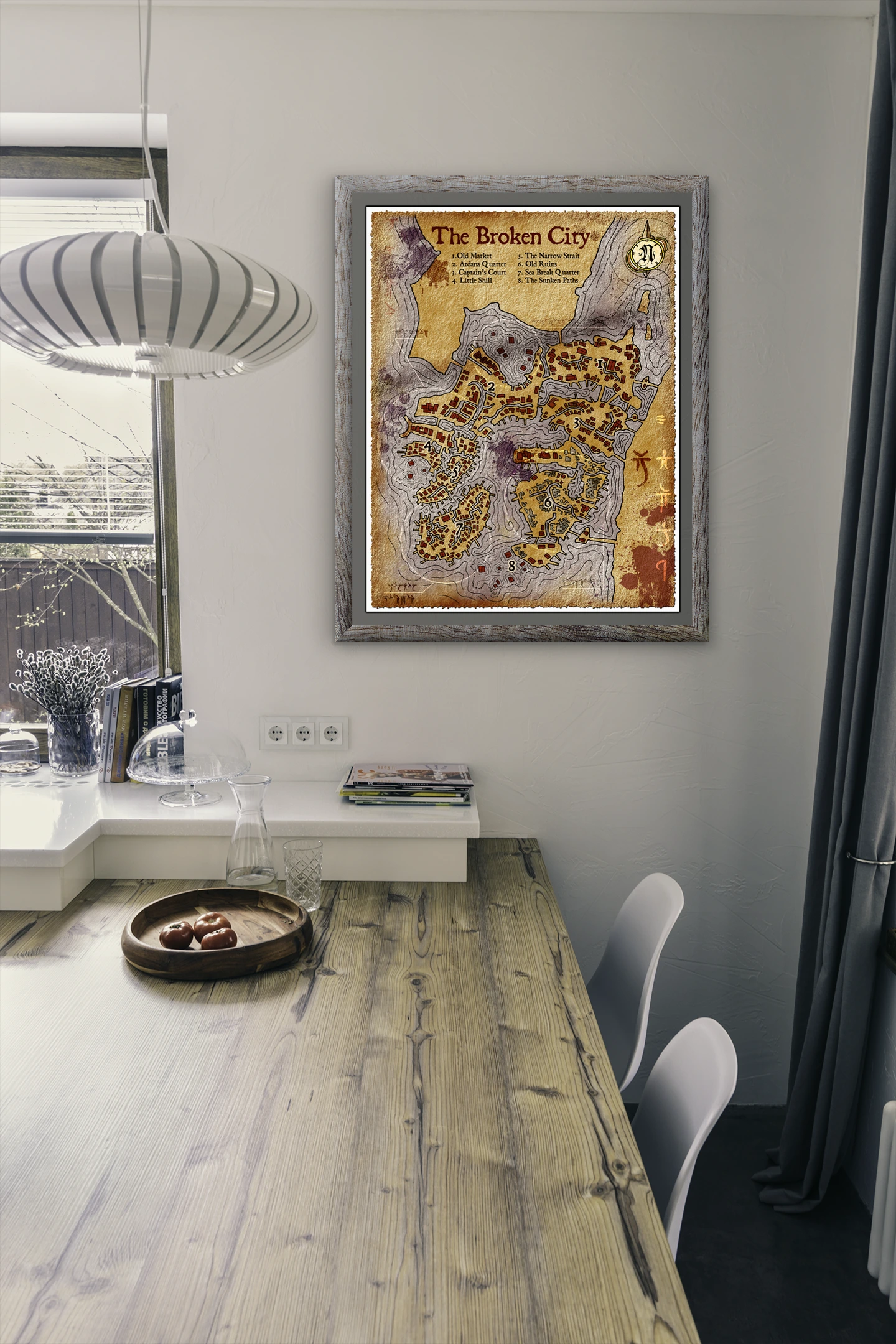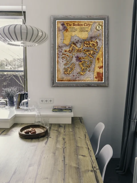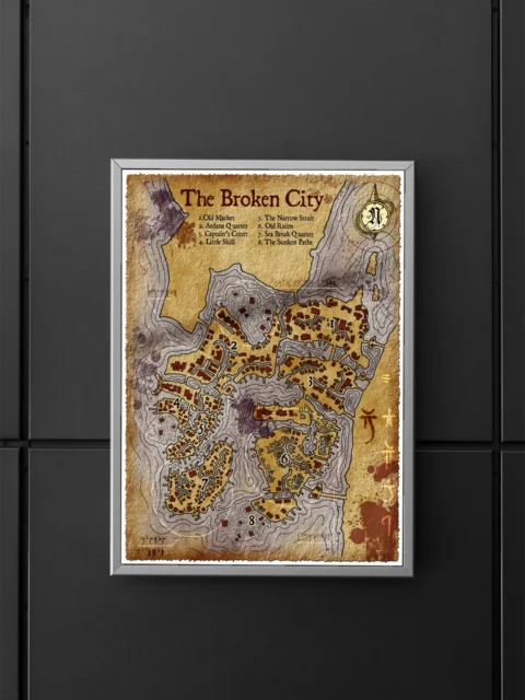 Dungeon masters running urban campaigns track NPC locations and faction territories across these eight districts. The numbered quarters let you assign encounters, safe houses, and plot hooks without redrawing notes. For D&D 5e players, this broken city fantasy battle map canvas print particularly anchors heist adventures and political intrigue.