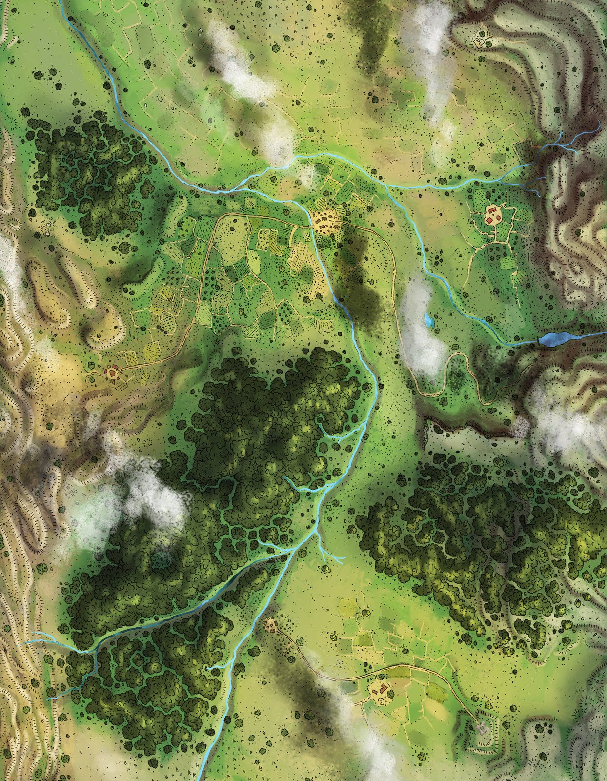 The Brycshire Town Fantasy Map depicts a valley rich with color and history. Inspired by 9th-century Anglo-Saxon settlements, it offers the perfect “home base” for adventurers. Because its design draws heavily from historical sources, the map works equally well for fantasy campaigns, historical scenarios, or even sci-fi adventures on low-tech frontier worlds.