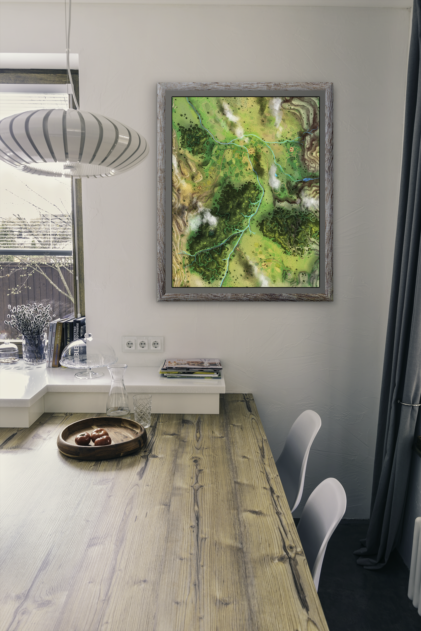 As a result, Brycshire Town becomes more than a backdrop — it’s a living world. Secret glades may conceal shrines to old gods, rugged hills might hide dangerous monsters, and villages scattered across the valley could be allies, rivals, or divided by shifting borders. In addition, this archival-grade canvas print by Alyssa Faden preserves every detail, making Brycshire Town both a tool for storytelling and a collectible work of art.