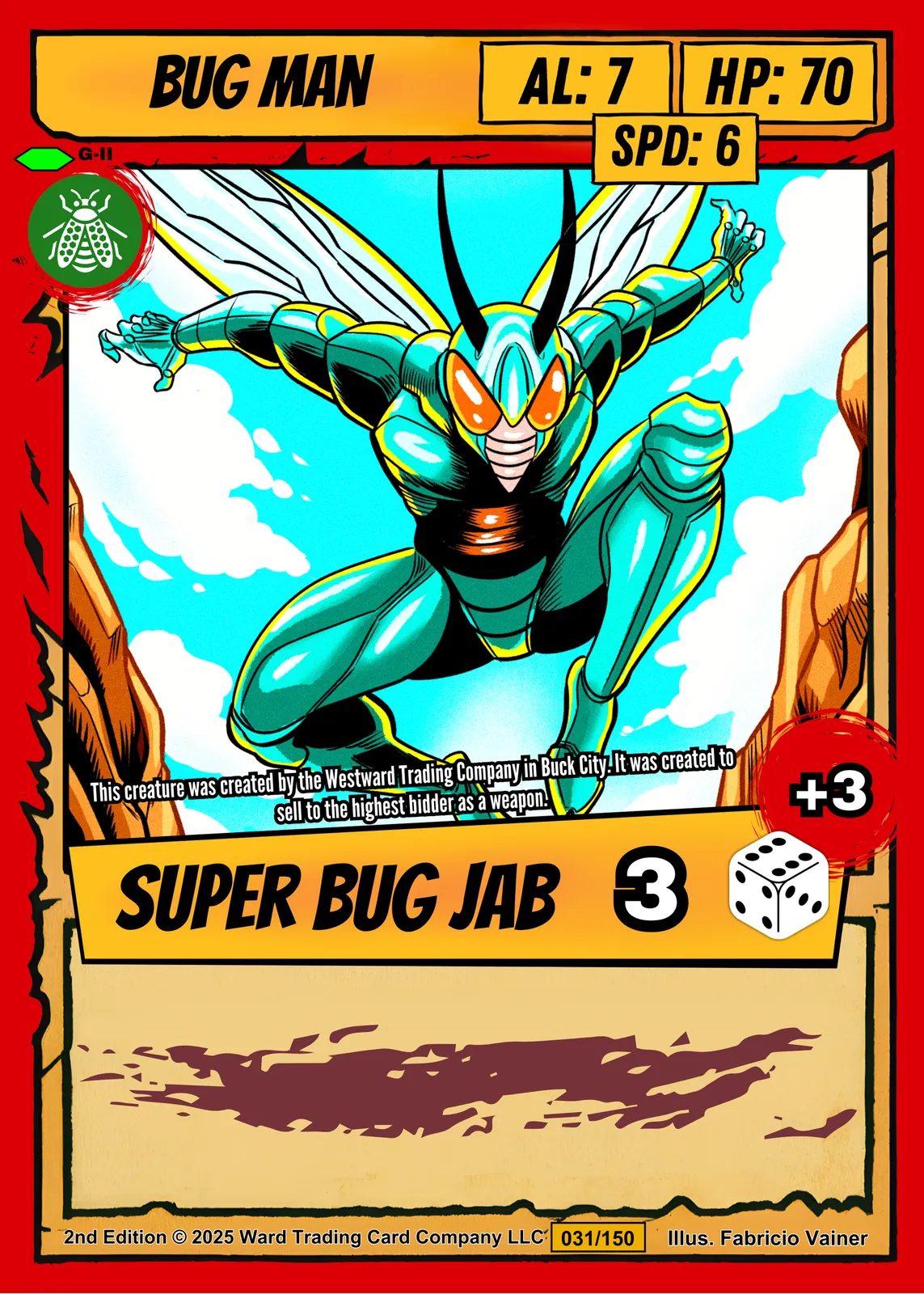 Additionally, the weathered red border frames orange header banners showing the name and stat values. Upper stats read AL: 7, HP: 70, and SPD: 6. The bottom yellow bar displays SUPER BUG JAB with a dice icon and red +3 modifier.