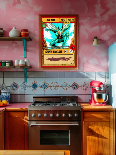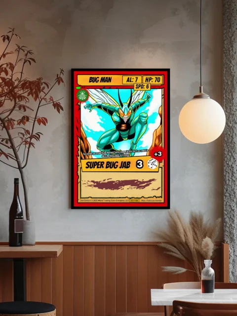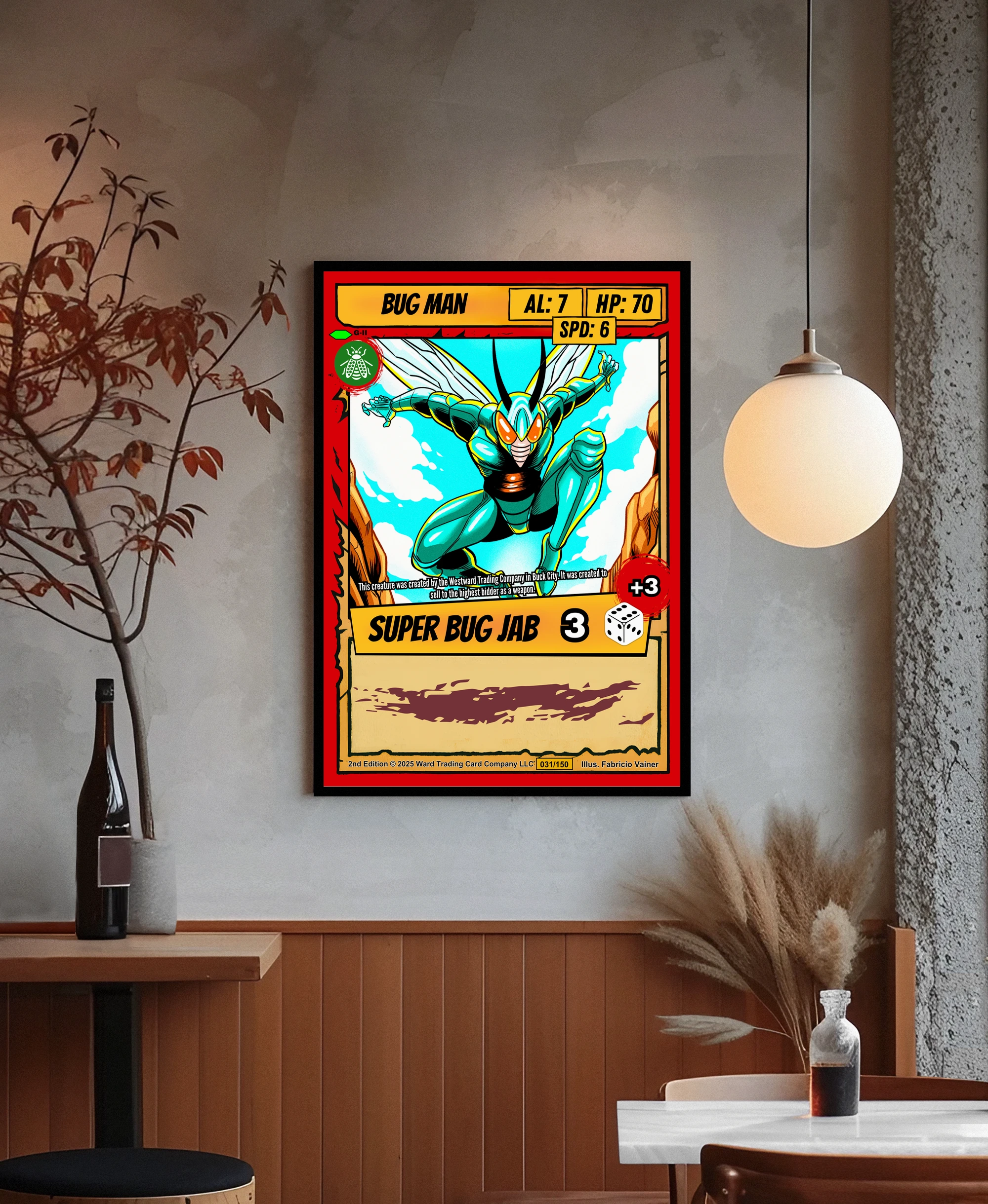 This piece fits game rooms with superhero or insect-themed collections. Specifically, it works above card storage shelves or alongside other Ward TCG character prints.
