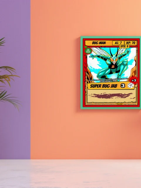 Rocky cliff formations and desert terrain anchor the composition at room scale. Collectors of insect-themed heroes and Ward TCG enthusiasts recognize the character design immediately. This bug man trading card canvas print delivers the full card layout without reduction or cropping.