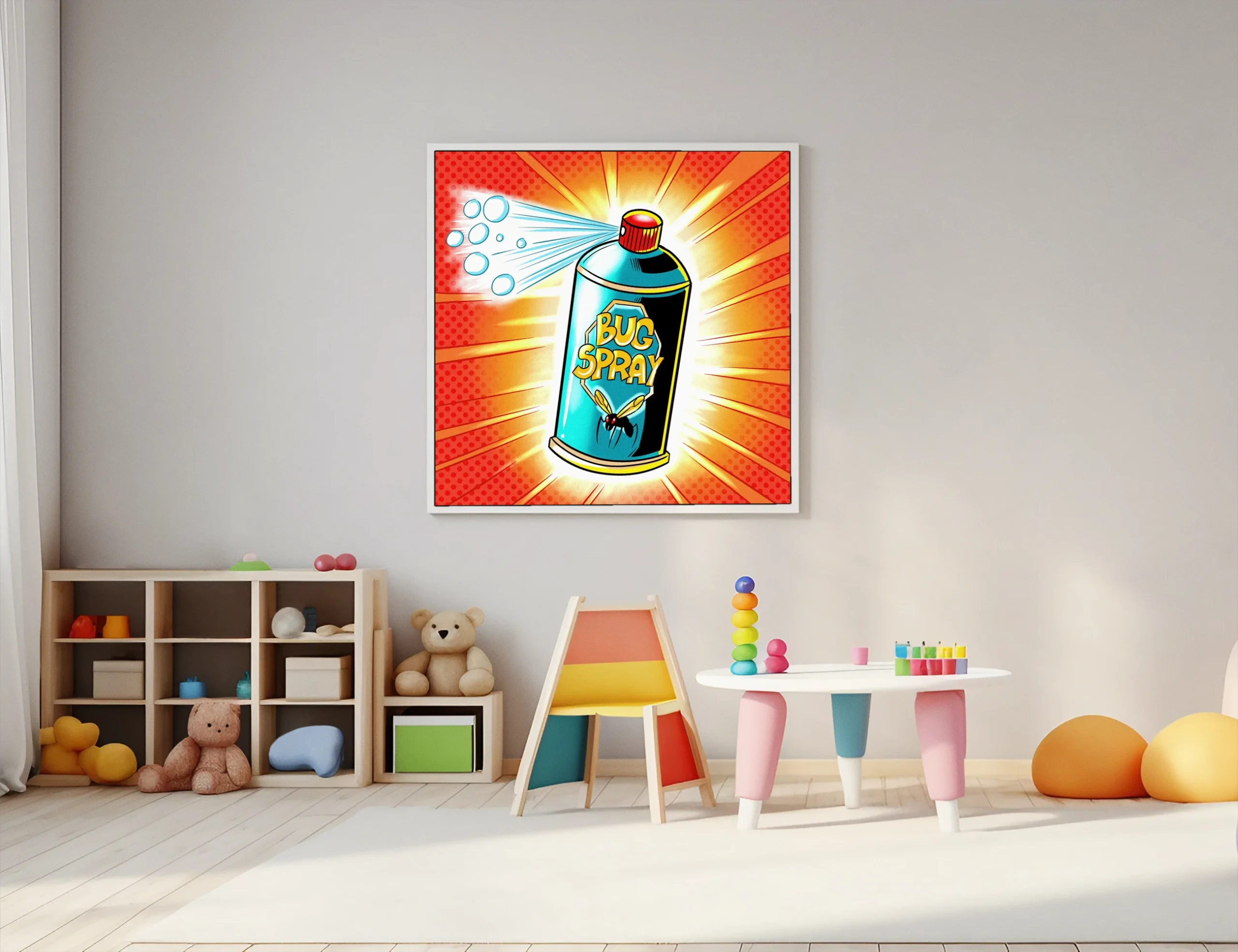 This print energizes game rooms or creative studios where bold color and comic book nostalgia feel at home. Additionally, it works particularly well in spaces celebrating retro advertising aesthetics and playful illustration.