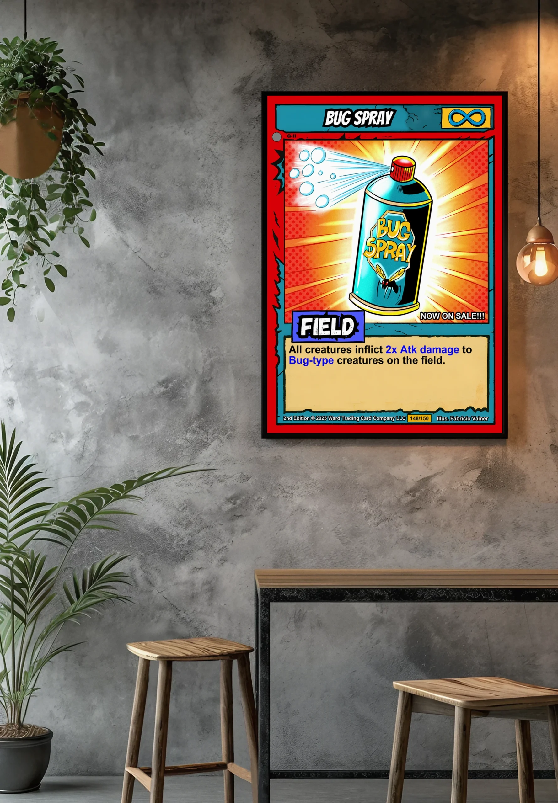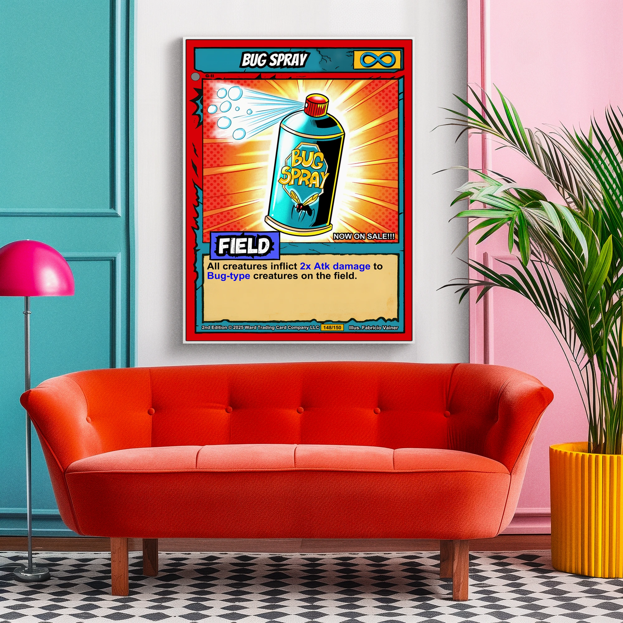 The playful pop art style reads clearly from across the room. Ward collectors and retro game enthusiasts appreciate the humorous take on everyday items as game mechanics. This bug spray trading card canvas print works especially well in spaces celebrating nostalgic gaming culture.
