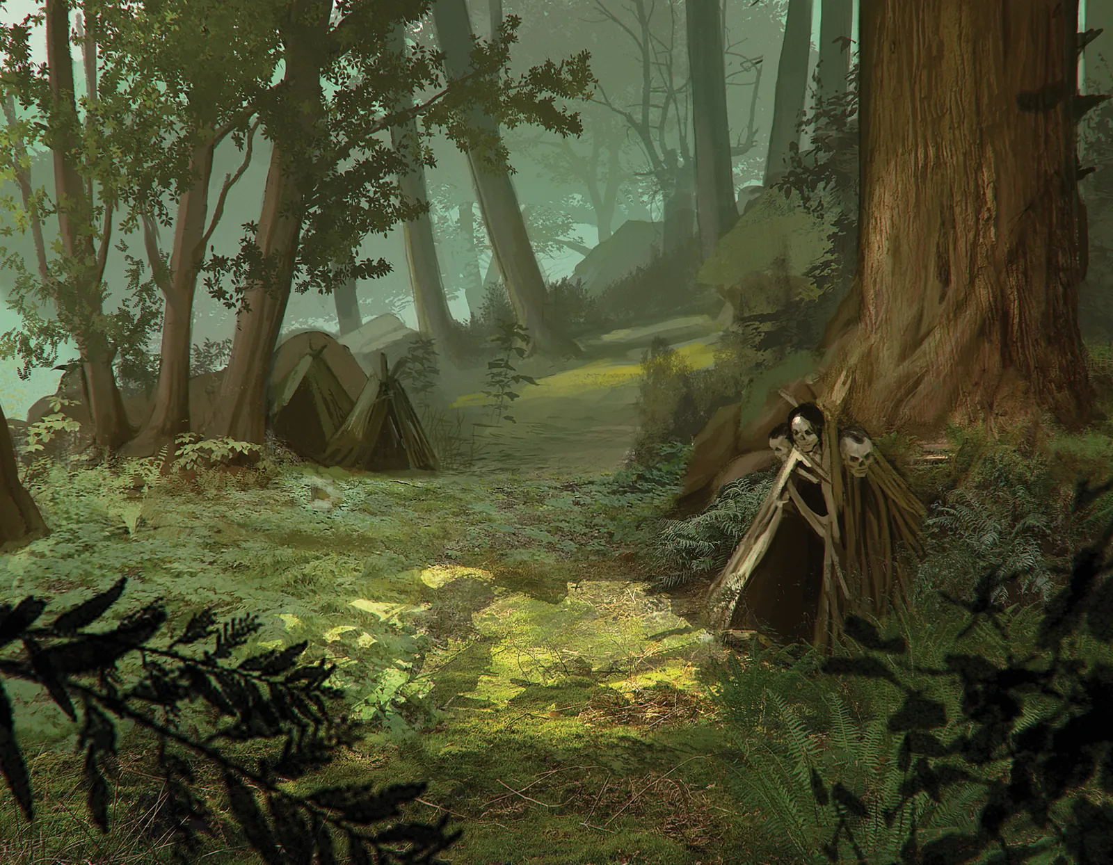 Additionally, the composition uses depth and framing to guide the eye along the forest path. However, skulls, makeshift shelters, and obscured forms interrupt the calm, reinforcing danger without overt action and grounding the Bugbears fantasy illustration in tension and restraint.