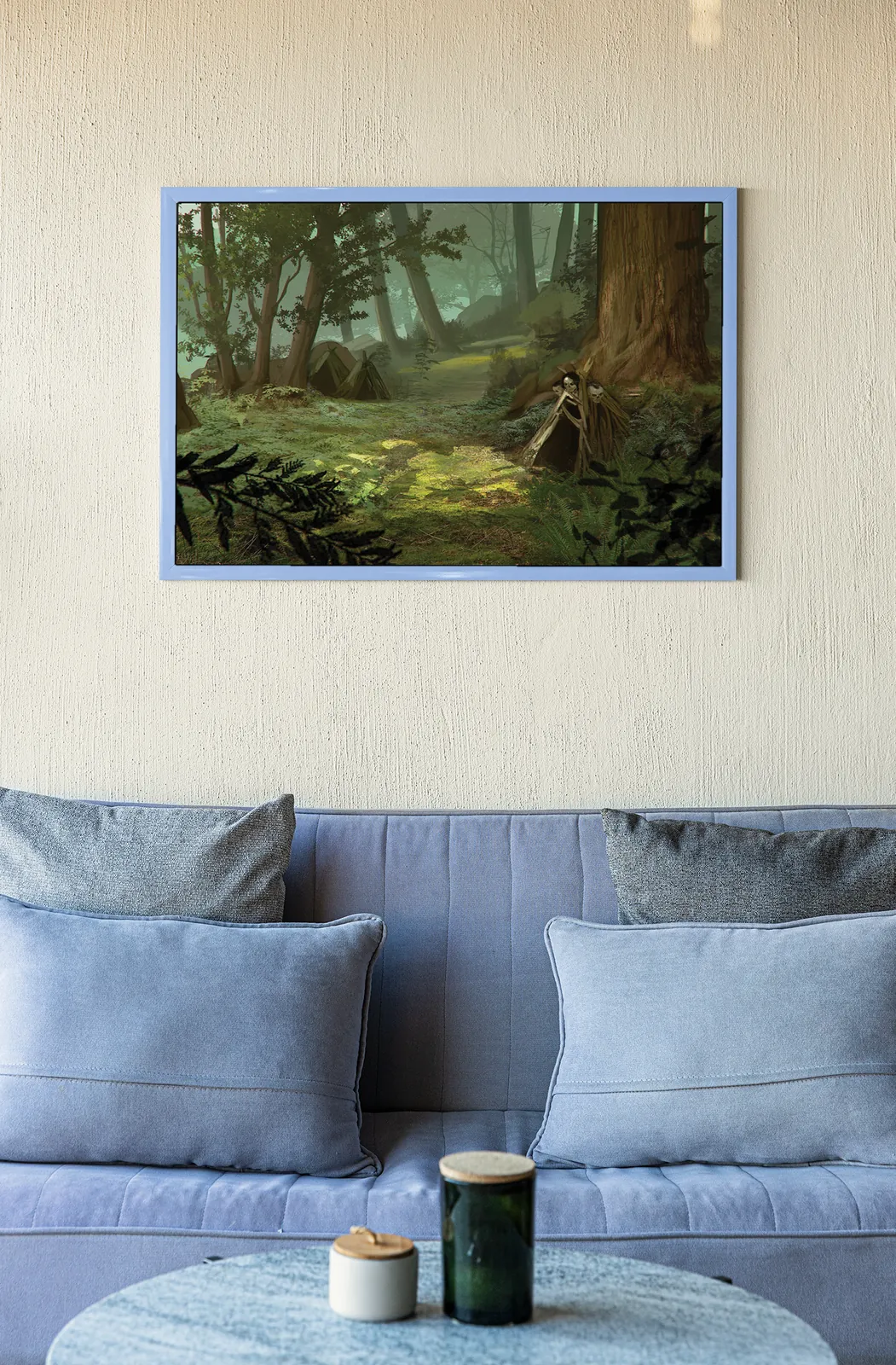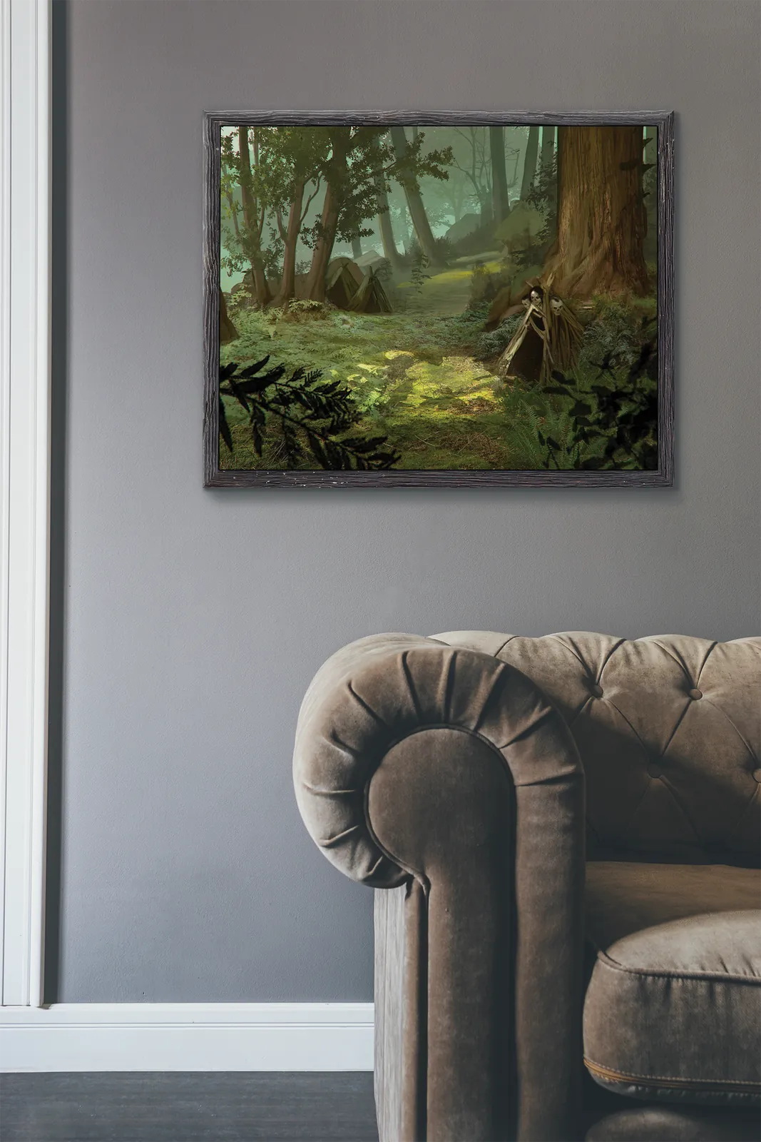 Bugbears Canvas Wall Art introduces Bugbears fantasy illustration through a quiet woodland scene charged with unease and latent threat. Moreover, the mossy forest floor, towering trees, and dim green light establish an atmosphere of watchfulness, as hidden figures seem to observe from the shadows.