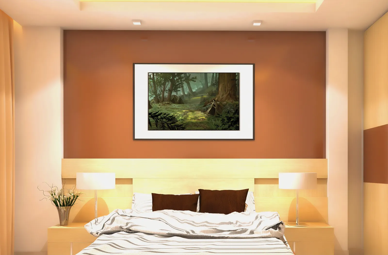 Finally, the artwork creates presence through mood rather than spectacle. Consequently, its layered greens and controlled lighting give the piece strong wall impact, while close viewing reveals environmental storytelling and fine illustrative detail.