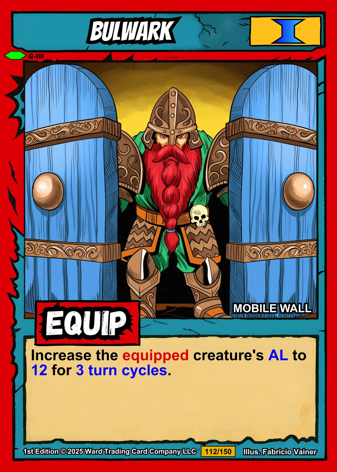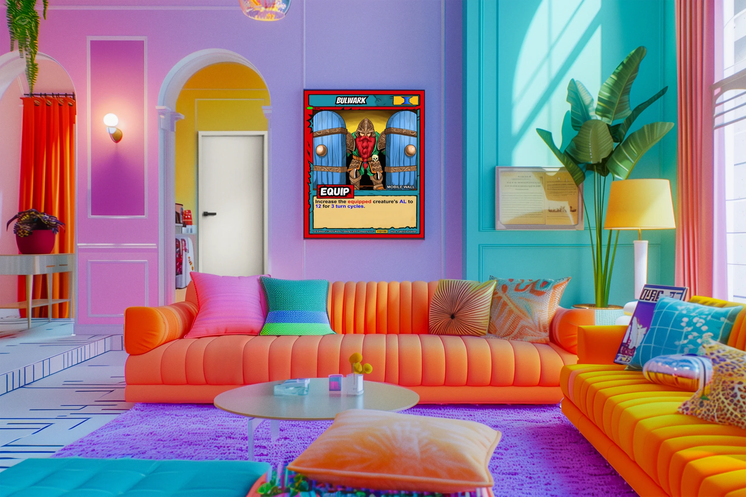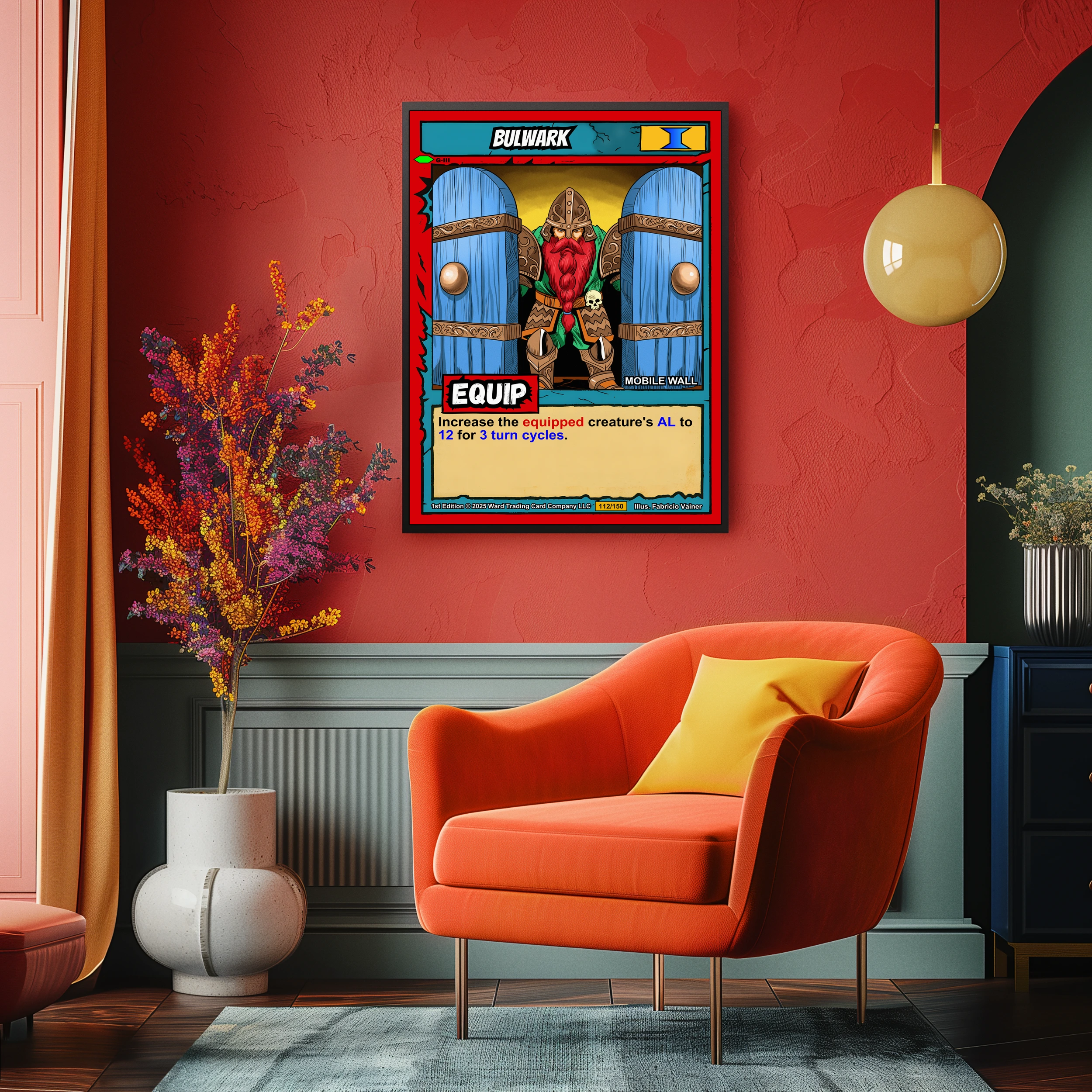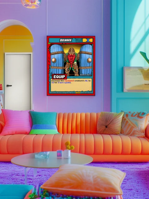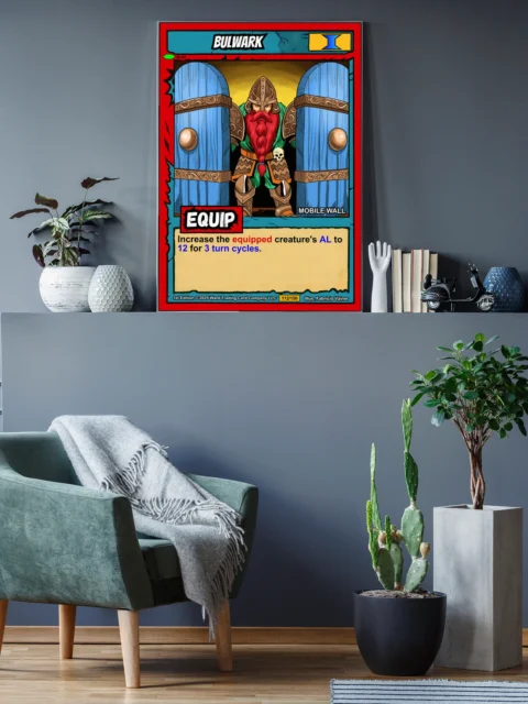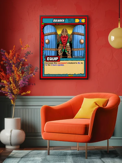 At room scale, the card’s comic book aesthetic reads clearly from across a gaming space. Collectors who run Equipment decks recognize the MOBILE WALL subtype immediately. This bulwark trading card canvas print works for players who appreciate Ward TCG defensive strategies.