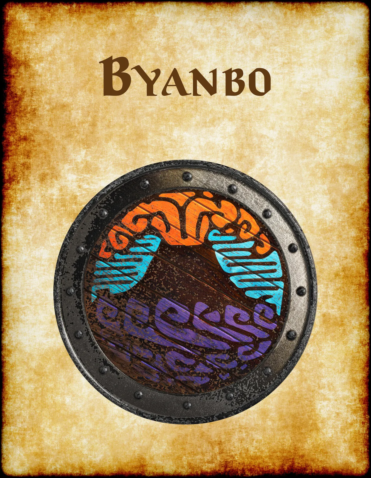 Additionally, Byanbo appears in Anna Meyer’s Greyhawk canon as a minor realm within the Flanaess political landscape. The tricolor scheme divides the shield into flowing horizontal registers of warm and cool hues. Moreover, the aged parchment backing reinforces the device’s antiquarian authenticity.